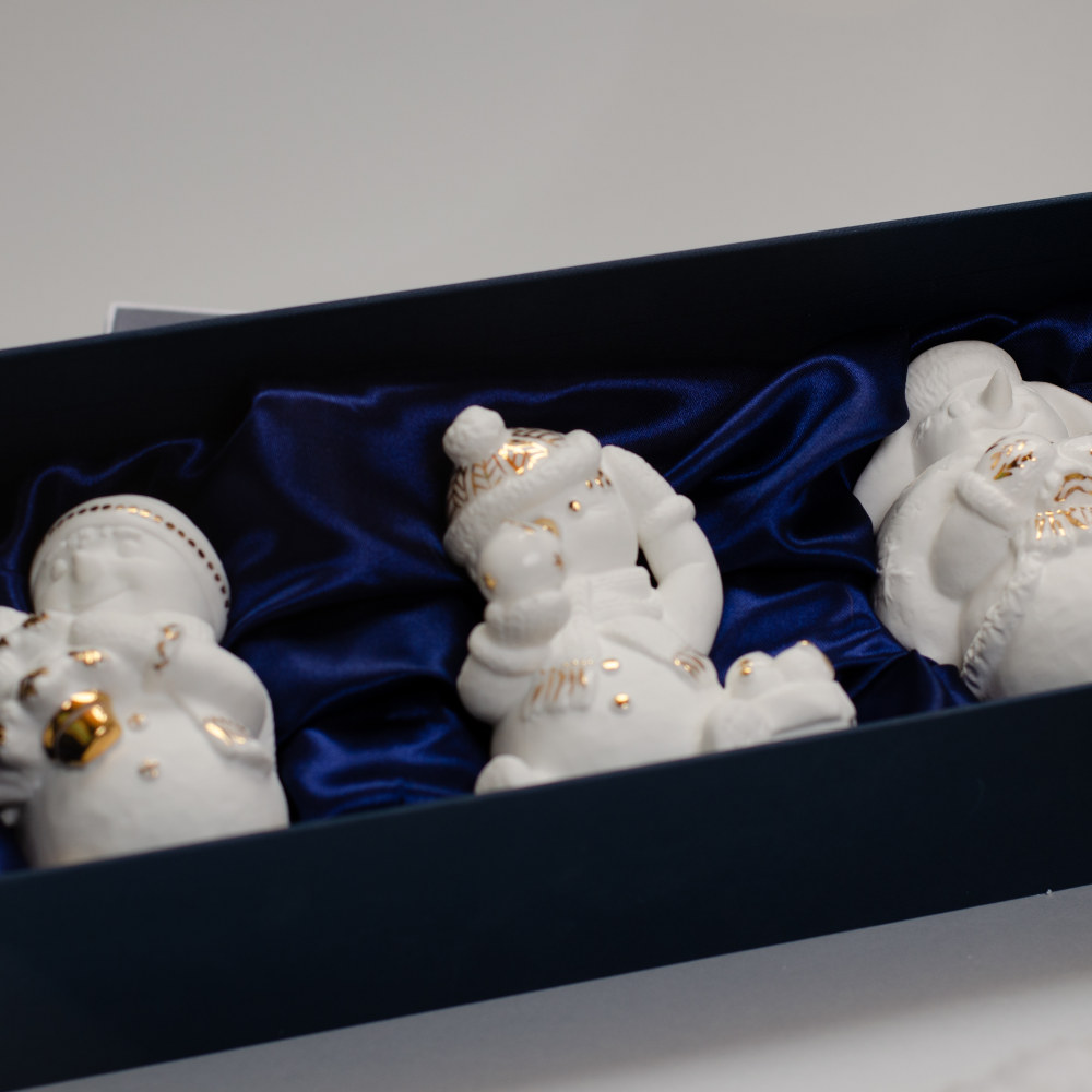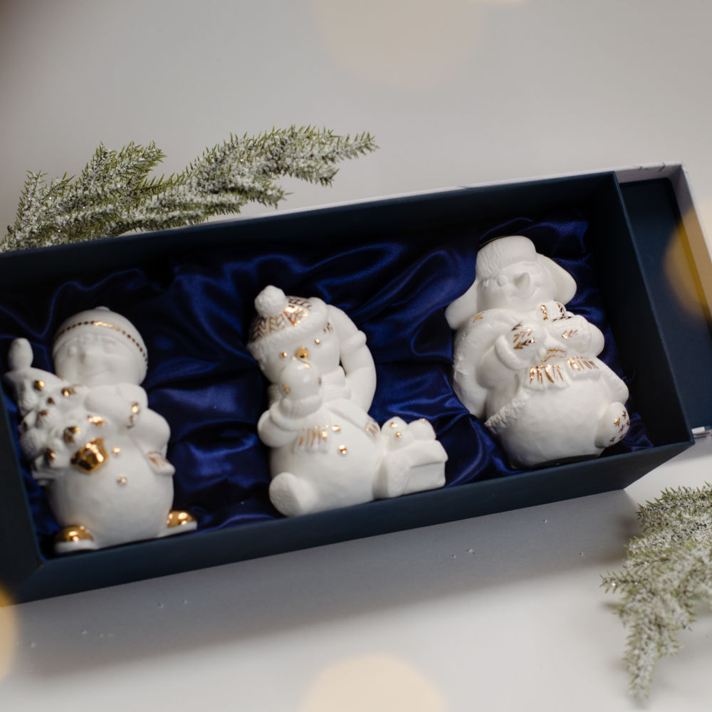 Набор интерьерных фигурок «Три снеговика» выполнен из фарфора бисквита, украшен ручной росписью золотом, придающей изделиям праздничное сияние.