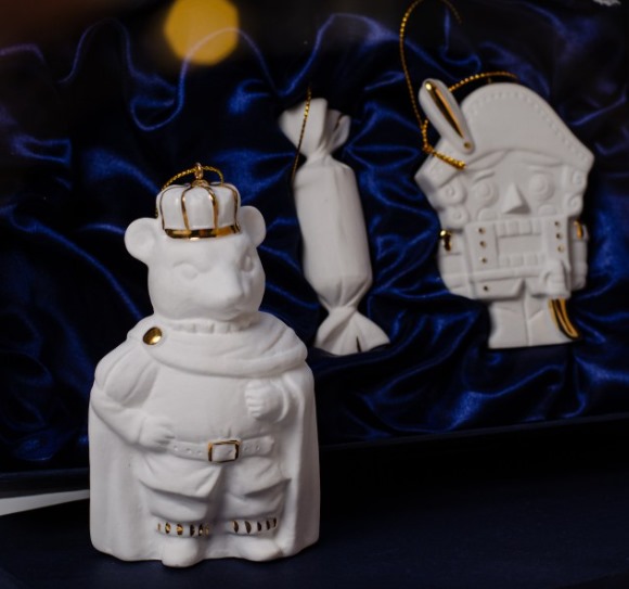 Подвесы в наборе “Щелкунчик, конфета, мышиный король”, изготовлены вручную из фарфора бисквита и украшены художественной росписью золотом. Текстура фарфора придает им мягкий матовый оттенок, который прекрасно сочетается с золотом, создавая эффект благородства и изысканности.