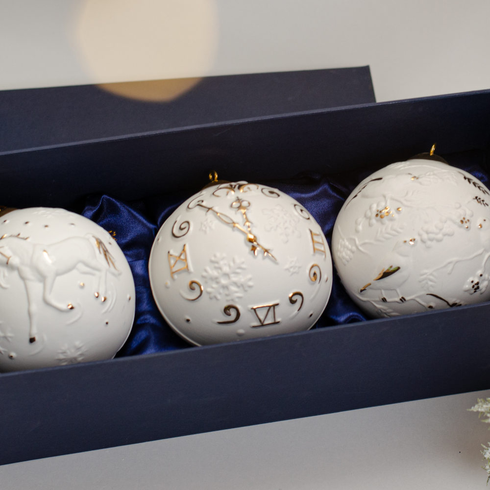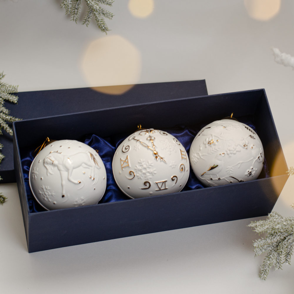 В набор входят три шара: “Птицы”, “Часы” и “Лошадь”. Каждое изделие изготовлено из фарфора бисквита и украшено ручной художественной росписью золотом. Матовая поверхность фарфора в сочетании с золотыми акцентами образует гармоничный дуэт, дарящий изделиям утонченность и аристократическую роскошь.