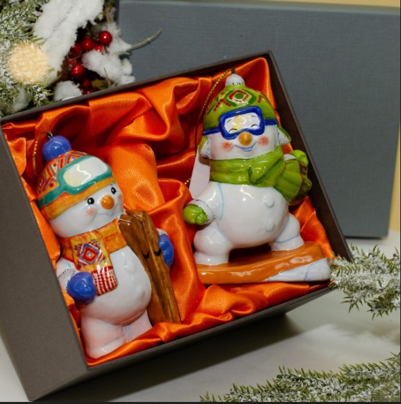 В набор елочных игрушек из коллекции “Снеговики спортсмены” входят 2 снеговика: “Снеговик лыжник” и “Снеговик сноубордист”. Подвесы изготовлены вручную в технике майолики.