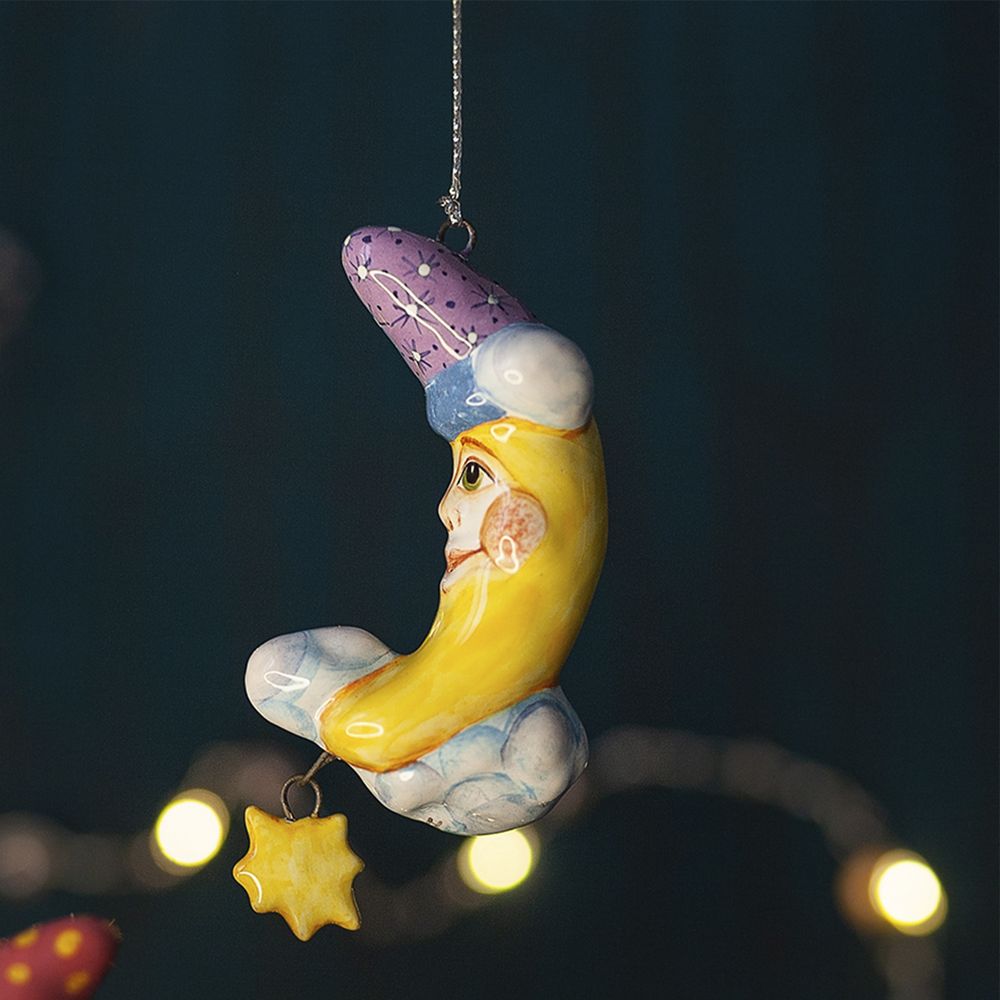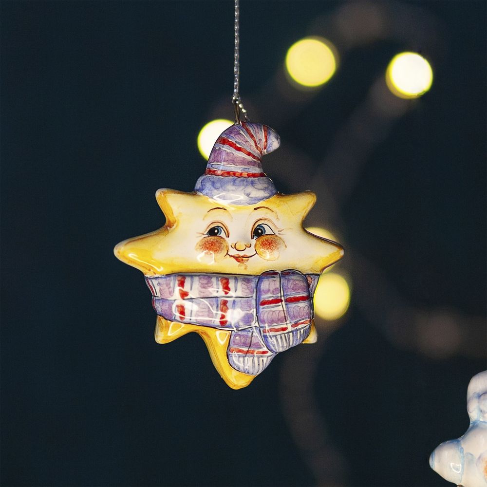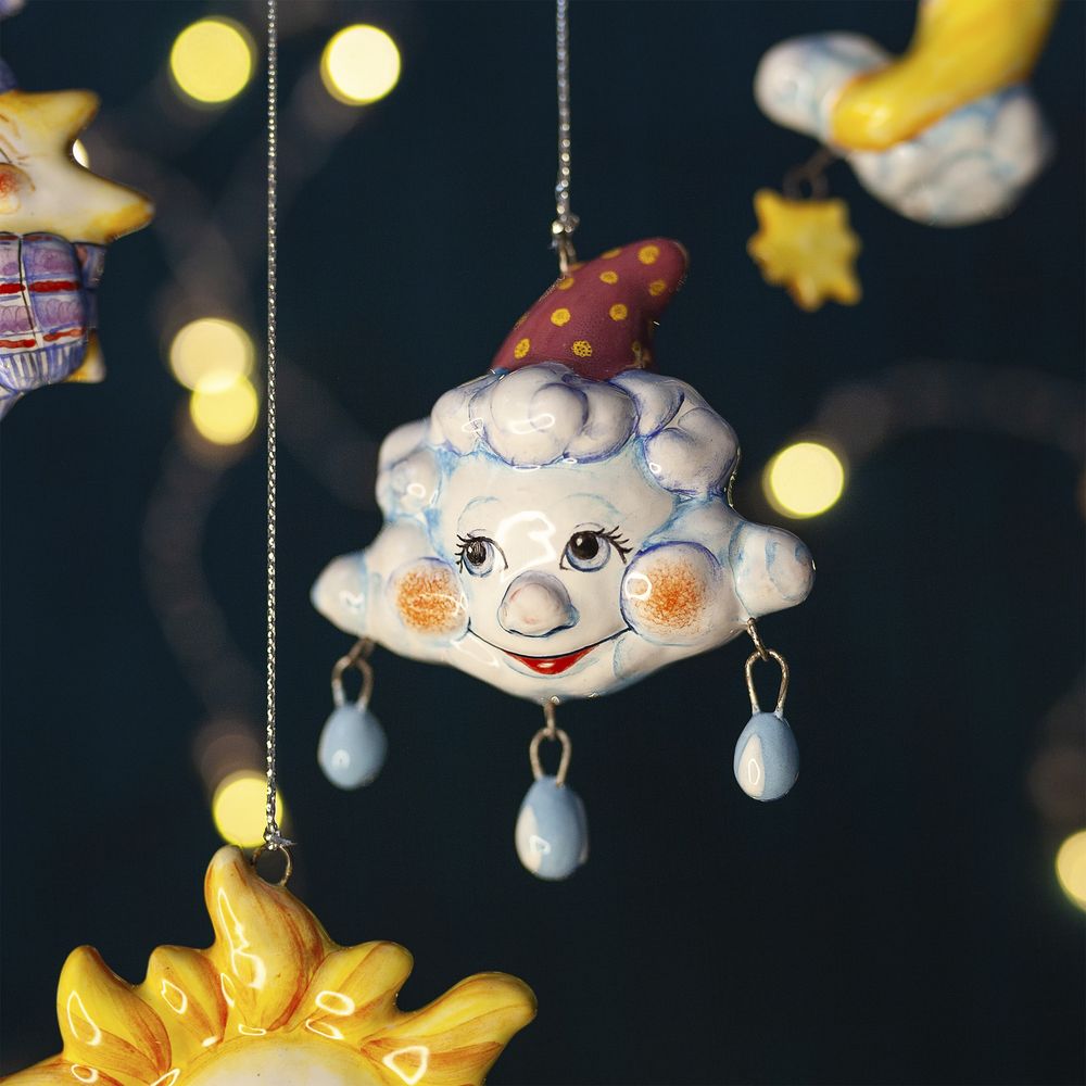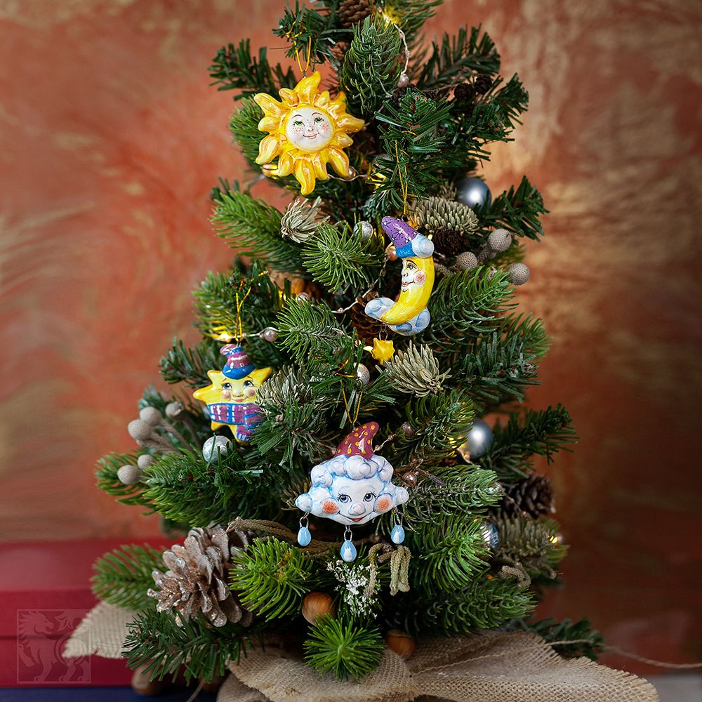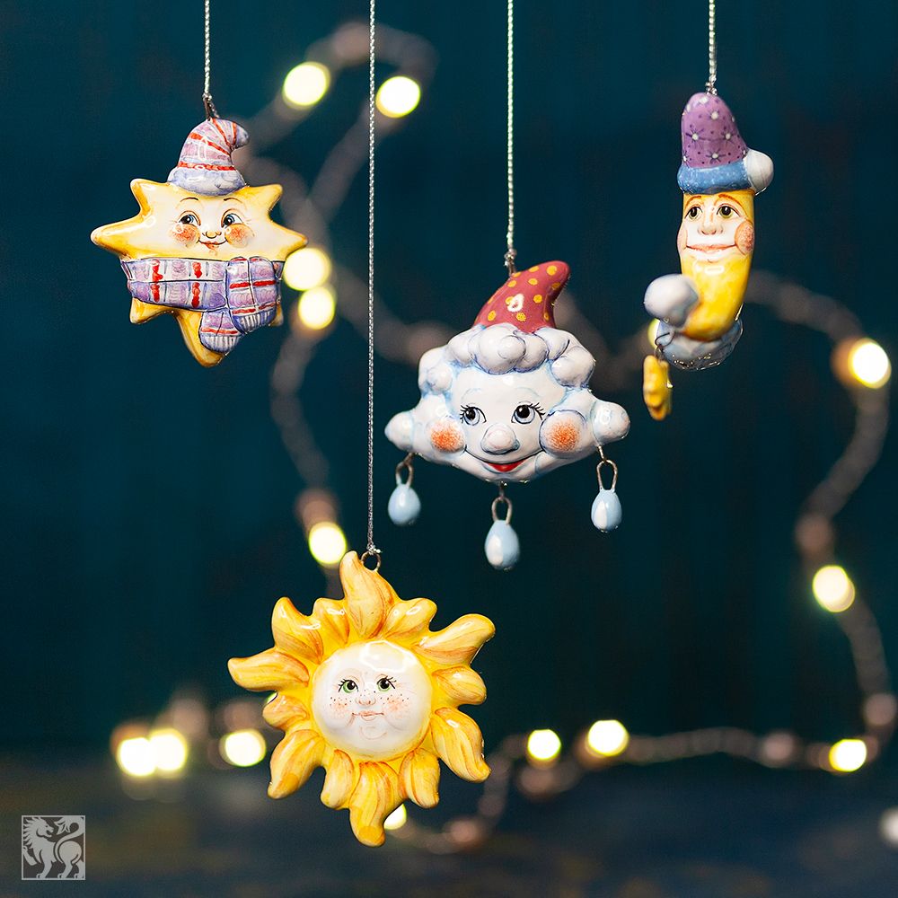 Это изделие представляет набор елочных игрушек ручной работы. В коллекцию “Небесные” входят елочные игрушки: Солнышко, Звездочка, Месяц, Тучка. Художник талантливо изобразил эмоциональные образы, разные характеры и расписал игрушки яркими глазурями. Выразительные глаза, воздушные мазки кисти настраивают на душевно легкое отношение к жизни. Коллекция никого не оставит равнодушным, будет чудесным подарком на любой праздник.
