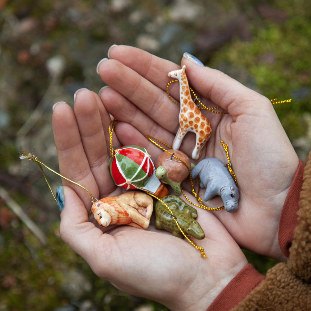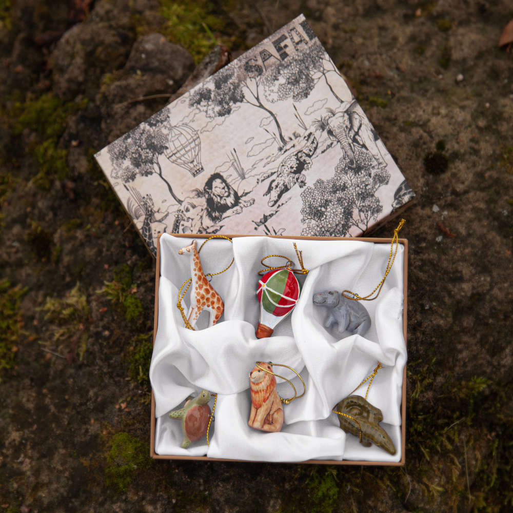В набор входят: лев, воздушный шар, черепаха, жираф, бегемот, крокодил. Так же набор будет упакован в красивую подарочную коробку. Каждое изделие — это уникальное сочетание гармоничной формы, узнаваемого образа и мастерского исполнения. Готовы устроить сафари на вашей ёлочке?