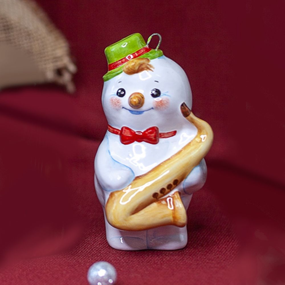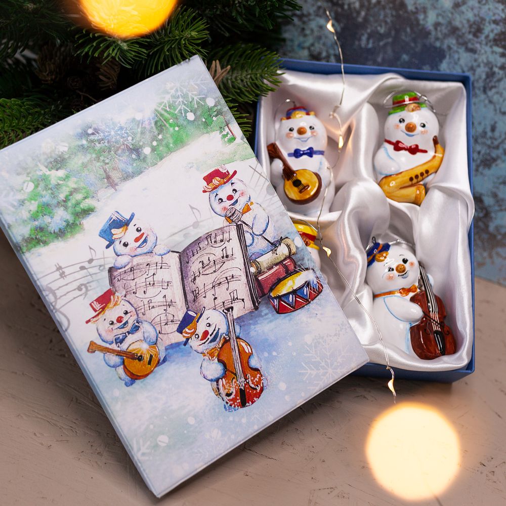 Это изделие представляет набор елочных игрушек ручной работы. В коллекцию “Снеговики музыканты” входят четыре снеговичка: с саксофоном, с контрабасом, с мандолиной, с микрофоном Художник талантливо изобразил эмоциональные образы снежных веселых обаятельных человечков, расписал их яркими красками. Улыбчивые, добрые – они будут сказочно смотреться на зеленой елочке, создадут настроение, будут чудесным подарком.