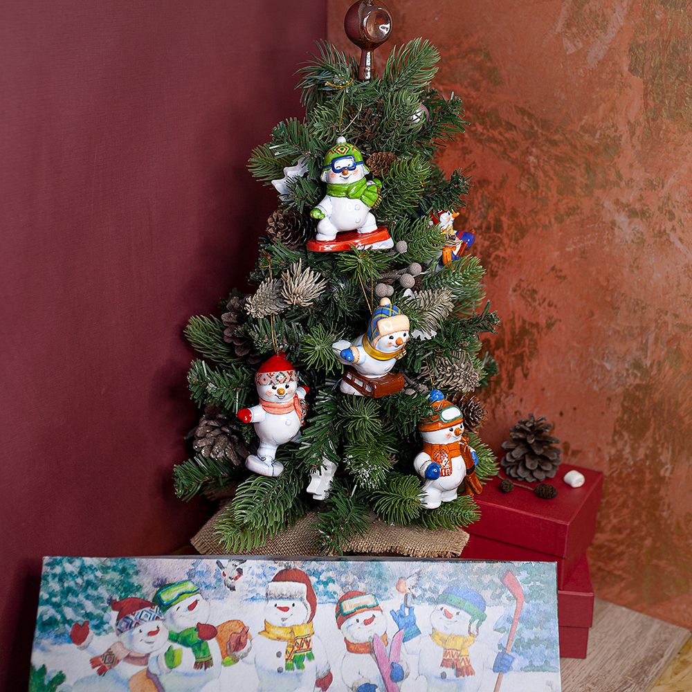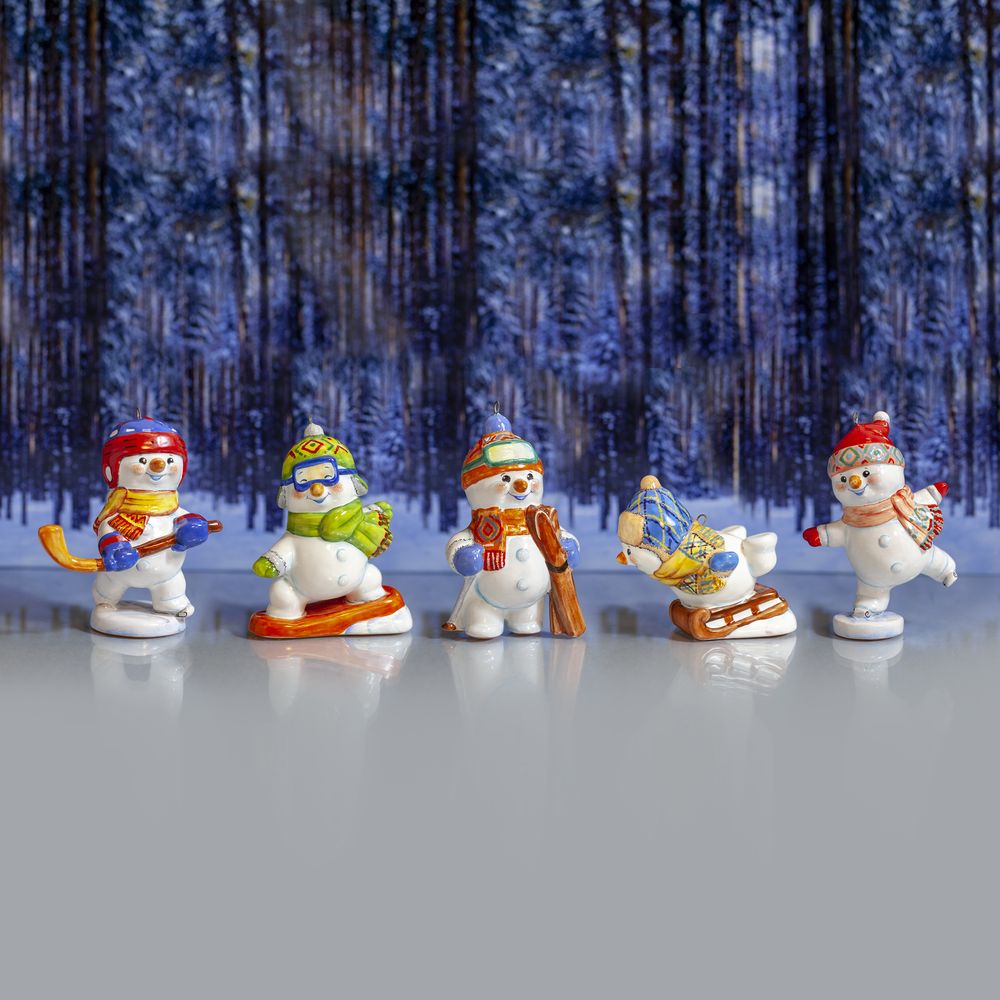 Это изделие представляет набор елочных игрушек ручной работы. В коллекцию “Снеговики-спортсмены” входят пять веселых обаятельных снеговичков: сноубордист, хоккеист, конькобежец, лыжник, снеговик на санках. Художник талантливо изобразил эмоциональные образы снежных человечков, расписал их яркими красками. Улыбчивые, добрые – они будут сказочно смотреться на зеленой елочке, создадут настроение, будут чудесным подарком.