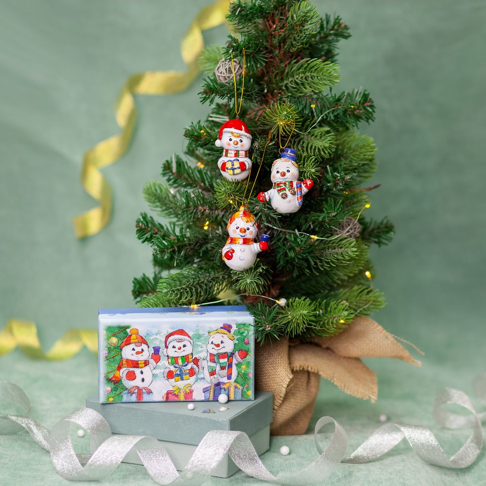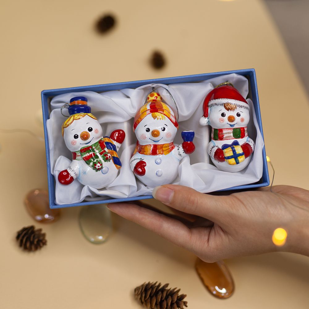 Набор “Три снеговика” изготовлен в технике майолика и украшен ручной художественной росписью. Три обаятельных снеговика, подарят массу положительных эмоций каждому кто их увидит, ведь у них в руках подарки и самые симпатичные на свете шапочки. Снеговики будут прекрасно смотреться на зеленой елочке, создавая атмосферу радости и праздника. Эти игрушки могут стать чудесным подарком для родных, друзей или коллег, принося хорошее настроение и украшая праздничный интерьер.