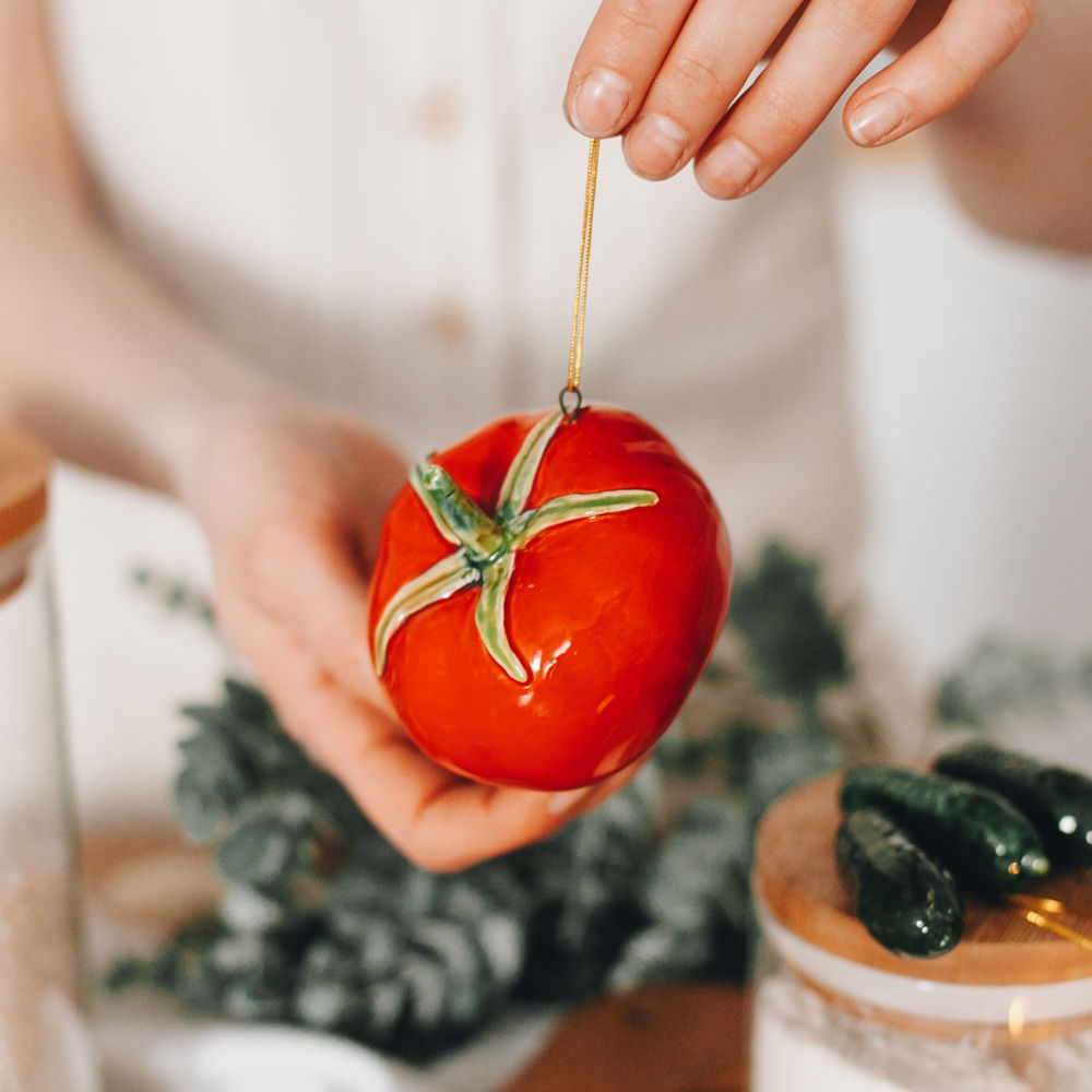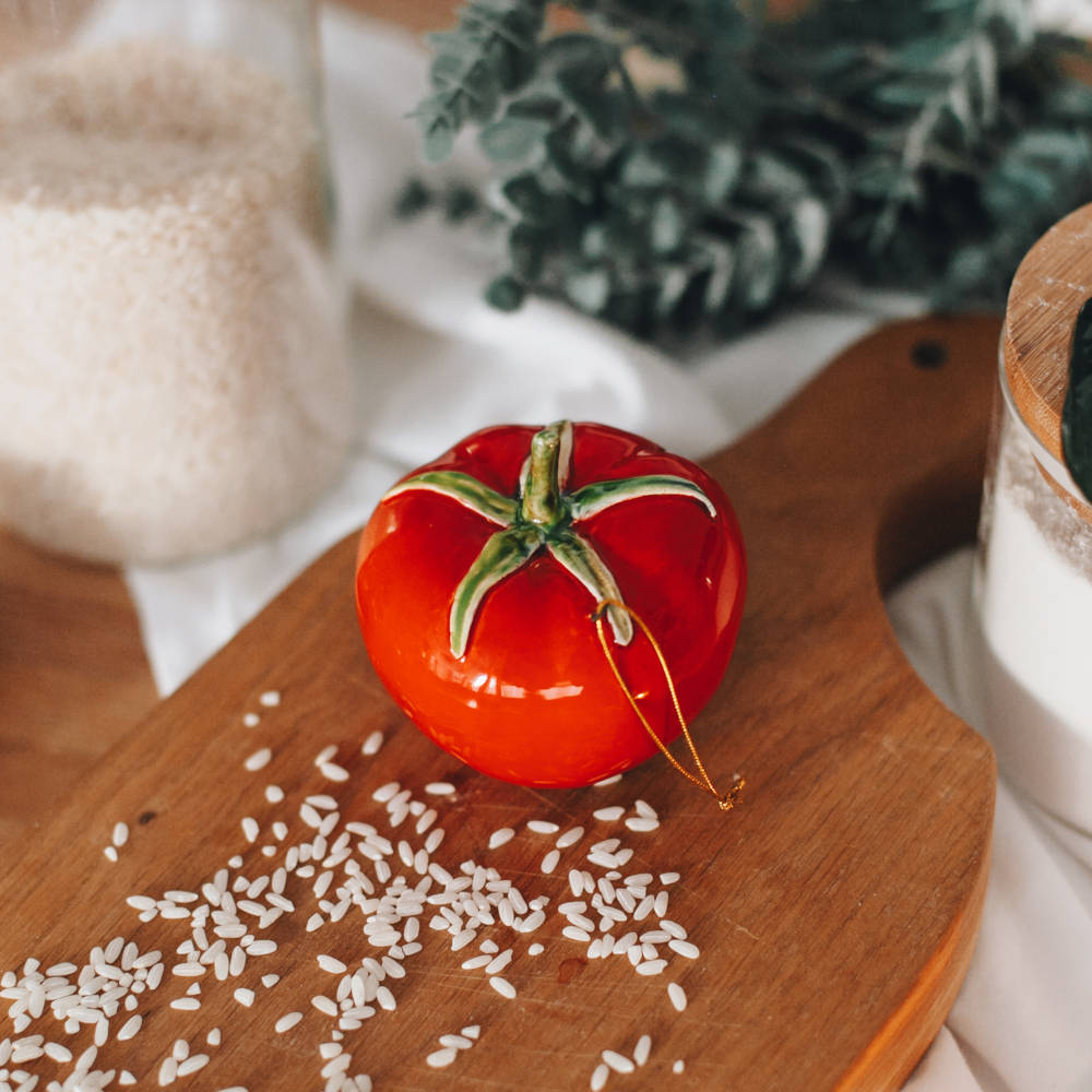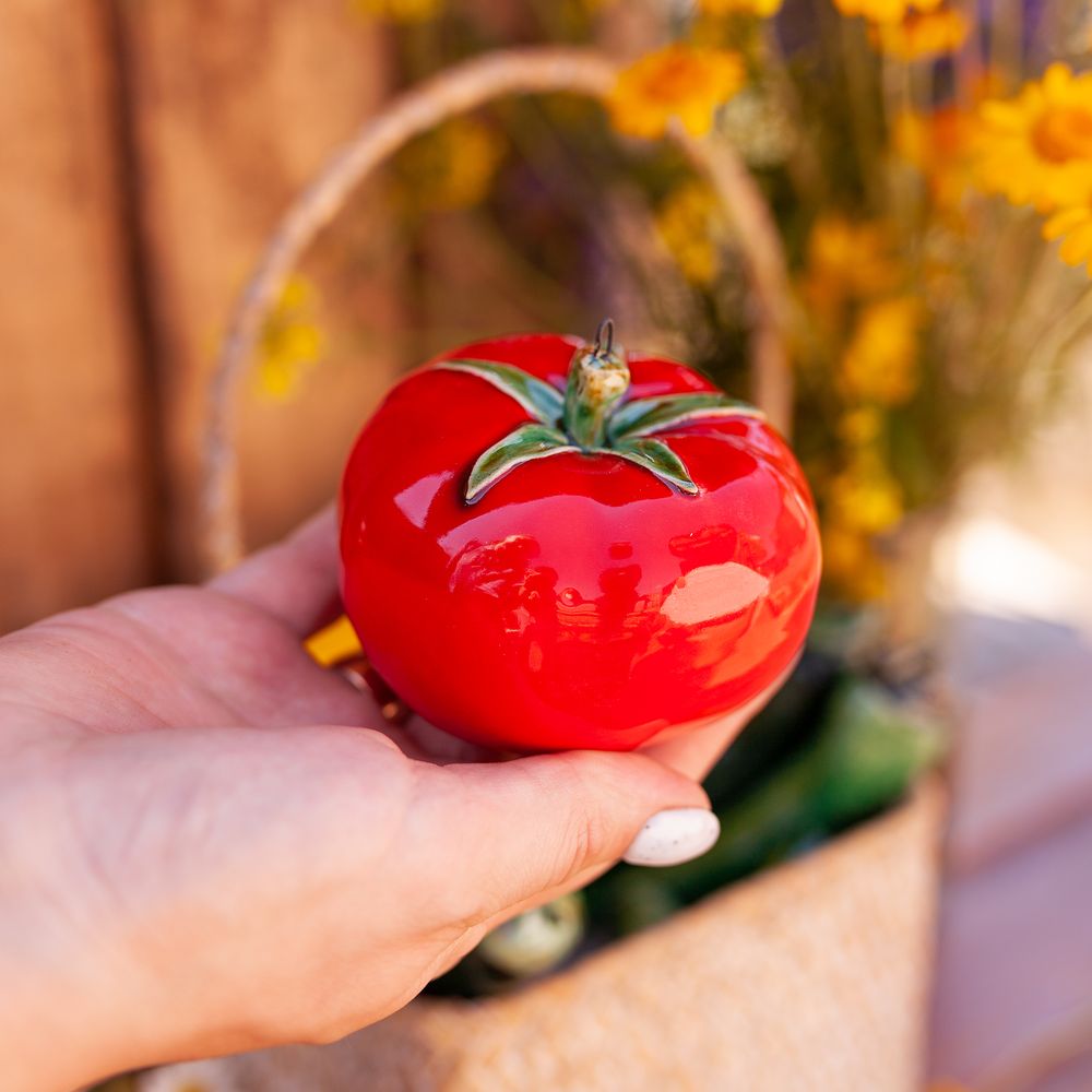 Изделие ручной работы представляет томат в натуральную величину. Художник воспользовался всей роскошной палитрой современных керамических глазурей, и вот перед нами настоящий “Сеньор Помидор”, он выглядит ярко, и совсем как настоящий. Помидор в переводе с французского языка означает: «Яблоко любви». Помидор всегда был символом человеческого сердца. Данное изделие станет украшением вашего интерьера, будет интересным подарком. Соберите всю коллекцию ярких и красивых фруктов и овощей. Блюдо с фруктами или овощами может быть использовано для создания эффектных интерьеров в кафе, ресторанах, барах или как модель на уроках рисования.