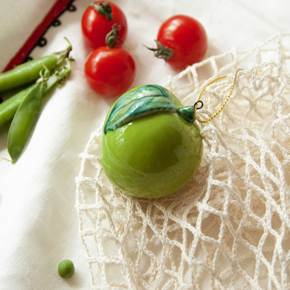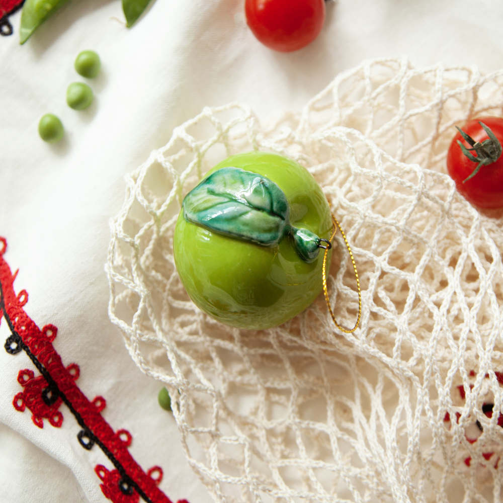 Подвес “Яблоко” изготовлен в технике майолика, украшен ручной художественной росписью и входит в коллекцию украшений “Фрукты и овощи”. Художник воспользовался всей роскошной палитрой керамических глазурей, благодаря чему изделие выглядит совершенно как настоящее. Такой подвес станет достойным украшением любого интерьера и одинаково хорошо будет смотреться в качестве кухонного декора, так и в виде елочного украшения. Прекрасный подарок для друзей и близких, а также для ценителей керамических изделий ручной работы.