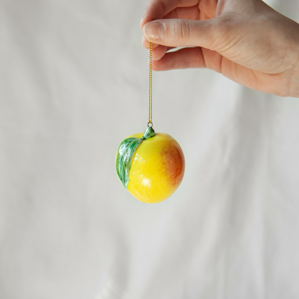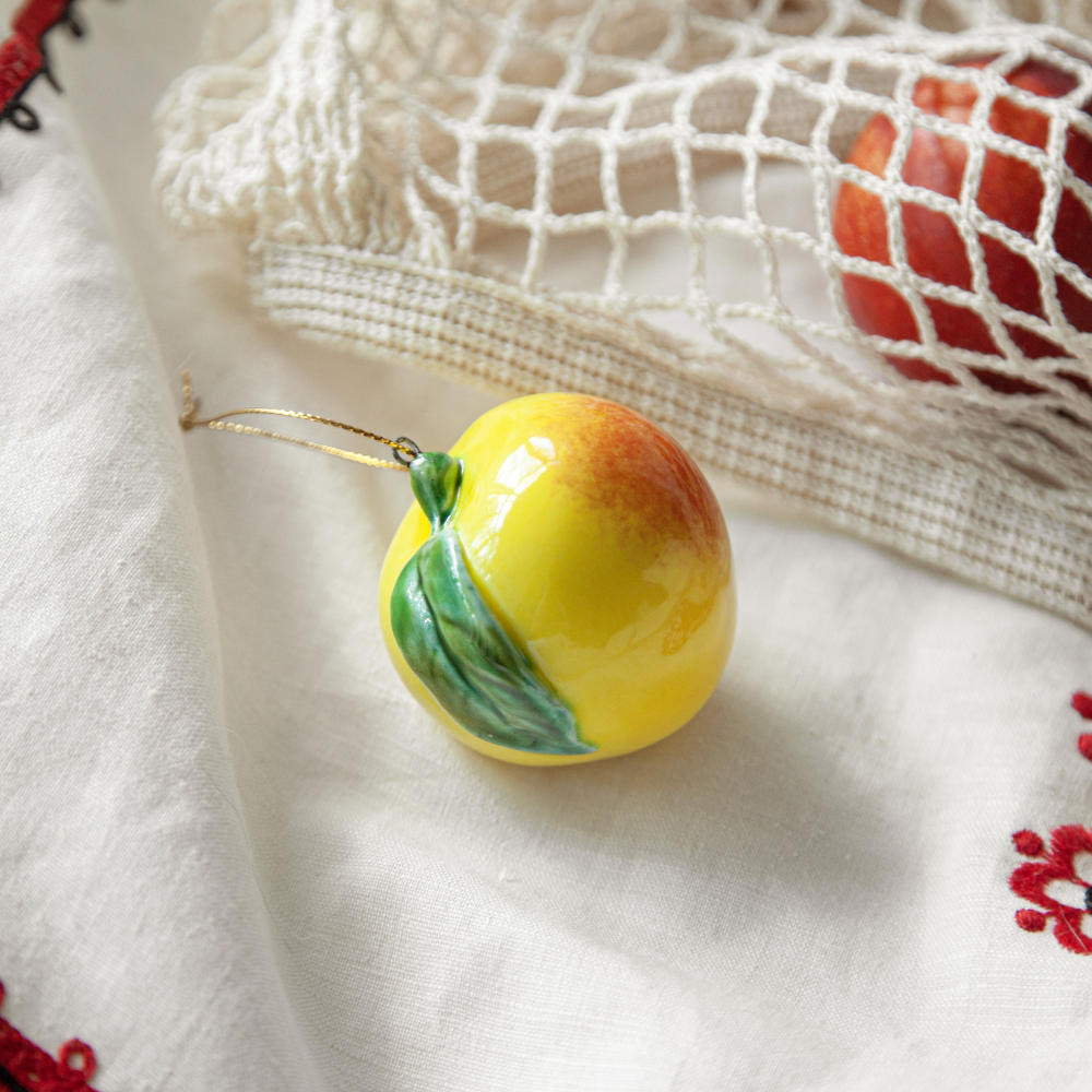 Подвес “”Яблоко” изготовлен в технике майолика, украшен ручной художественной росписью и входит в коллекцию украшений “Фрукты и овощи”. Художник воспользовался всей роскошной палитрой керамических глазурей, благодаря чему изделие выглядит совершенно как настоящее. Такой подвес станет достойным украшением любого интерьера и одинаково хорошо будет смотреться в качестве кухонного декора, так и в виде елочного украшения. Прекрасный подарок для друзей и близких, а также для ценителей керамических изделий ручной работы.