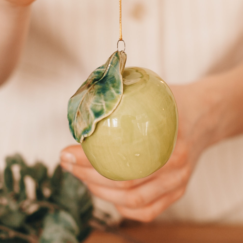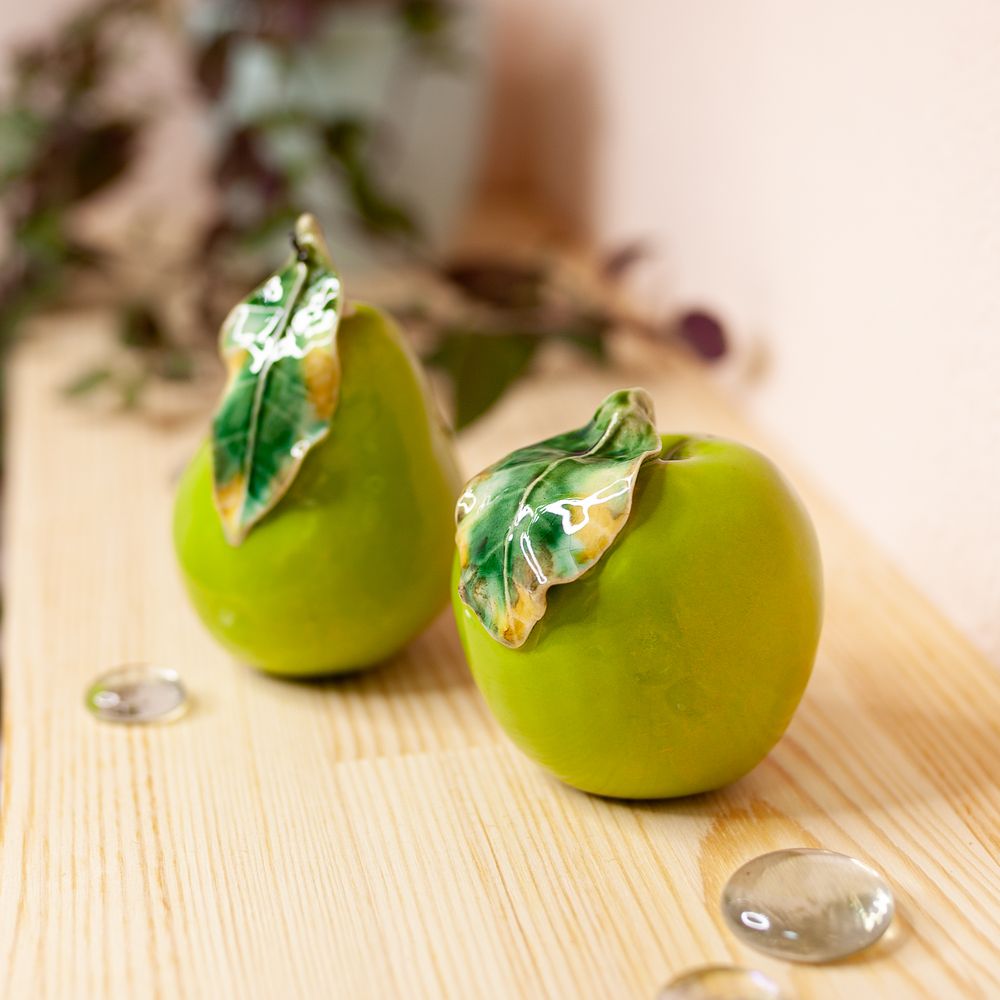Изделие ручной работы представляет керамическое яблоко в натуральную величину. Художник воспользовался всей роскошной палитрой современных керамических глазурей. Яблоко выглядит совершенно, как настоящее. В древних мифах яблоки являются символом знания, мудрости и солнечного тепла. Во многих культурах яблоко ассоциируется со здоровьем, плодородием, молодостью и любовью. У славян даже была традиция приносить матери новорожденного малыша яблоко, чтобы ребёнок набирался жизненной силы. Также во многих сказках народов мира можно встретить некие «молодильные яблочки», которые возвращают красоту и молодость. Яблоко станет украшением вашего интерьера, будет чудесным подарком на любой праздник. Соберите всю коллекцию ярких и красивых фруктов и овощей. Блюдо с фруктами или овощами может быть использовано для создания эффектных интерьеров в кафе, ресторанах, барах или как модель на уроках рисования.