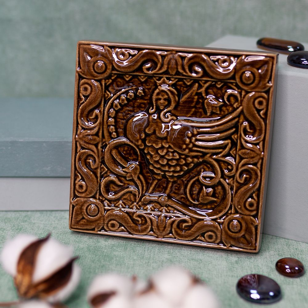 Изделие представляет керамический рельефный элемент квадратной формы, покрытый коричневой глазурью, на котором нанесено стилизованное изображение райской птицы с головой девы. Птица Сирин обладает прекрасным чарующим голосом. Она покровительствует слабому полу. Сирин символизирует свободу полёта, чистоту и высокую нравственность, её изображения становятся сильнодействующими оберегами и талисманами. Выбранный цвет изразца придает дополнительную смысловую нагрузку изделию, поскольку коричневый цвет символизирует плодородие, а ещё – основательность, устойчивость и стабильность. Данное изделие может быть использовано как изразец, и как самостоятельный настенный декор. При этом смотрится стильно и эффектно, может использоваться в местах, где фантазия архитектора или дизайнера по интерьеру не ограничивается типовым решением, он позволяет сделать акцент, привлекающий взгляд, внести завораживающую изюминку в интерьер. Изразец также будет прекрасным подарком родным, близким, коллегам по работе.