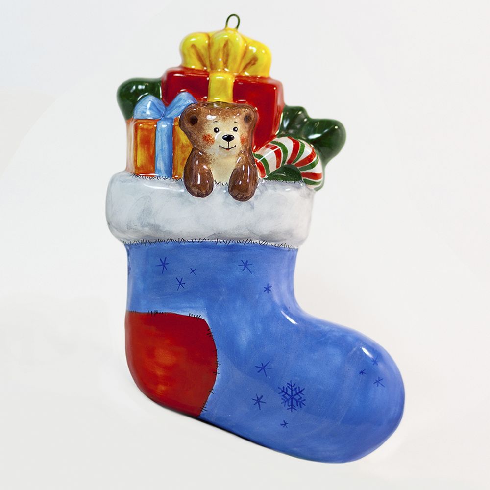 Эксклюзивное изделие ручной работы представляет собой плоский подвес с рельефной фигуркой разноцветного новогоднего носка с яркими подарками, игрушками и сладостями. Такая елочная игрушка будет замечательно смотреться, как на самой новогодней ели, так и в гирляндах, украшающих двери, лестницы, и, конечно в праздничных композициях, также будет прекрасным подарком к Новому году и Рождеству, принесёт радость, создаст настроение.