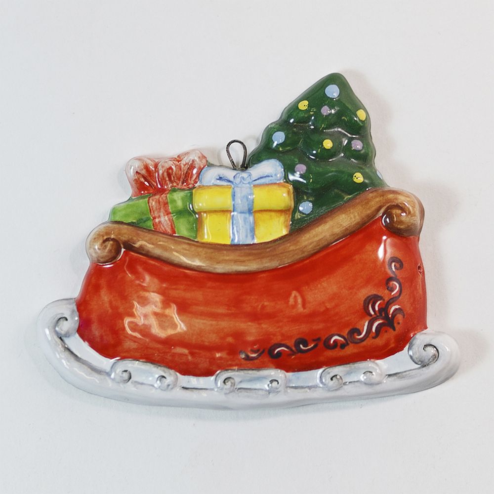 Эксклюзивное изделие ручной работы представляет собой плоский подвес с рельефной фигуркой разноцветных расписных саней, наполненных новогодними яркими подарками, и везущих на праздник пушистую зеленую елочку. Такая игрушка будет замечательно смотреться, как на самой новогодней ели, так и в гирляндах, украшающих двери, лестницы, и, конечно в праздничных композициях, также будет прекрасным подарком к Новому году и Рождеству, принесёт радость, создаст настроение.