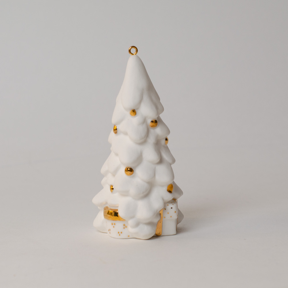 Подвес “Елка” изготовлен из фарфора бисквита и украшен тонкой золотой росписью. Текстура материала позволяет проработать каждую деталь изделия, придавая ему аккуратные формы.