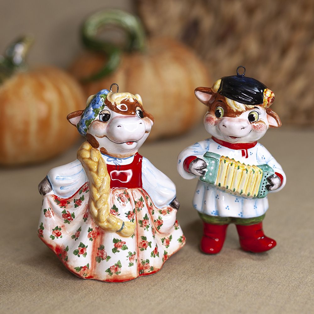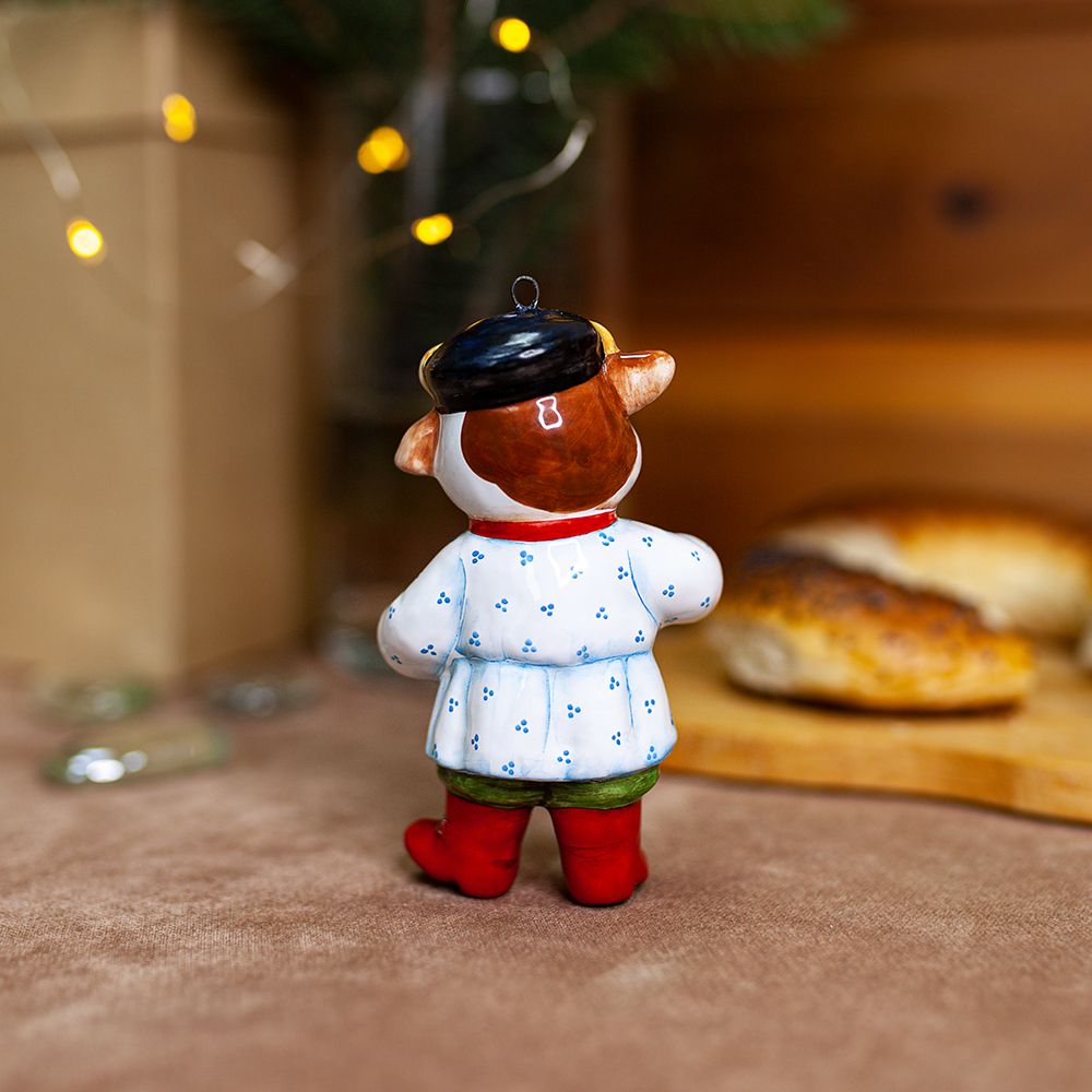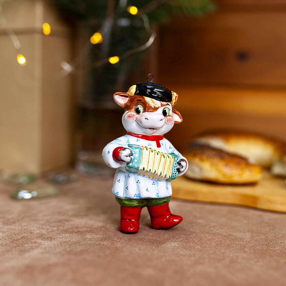 Ёлочная игрушка Бычок Яшка ручной работы входит в коллекцию Символы Года. Бычок и коровка верные помощники человека. Фигурка бычка принесет удачу на работе и в семье. Мы выбрали бычку ласковое имя Яшка, он душа компании, первый парень. У Яшки фуражка набекрень и цветочек из под чуба. Заливается гармошка. Эксклюзивная игрушка Бычок Яшка будет ярким украшением новогодней композиции и замечательным подарком людям, рожденным под этим знаком, или всем – к Новому году и Рождеству, особенно в год Быка.