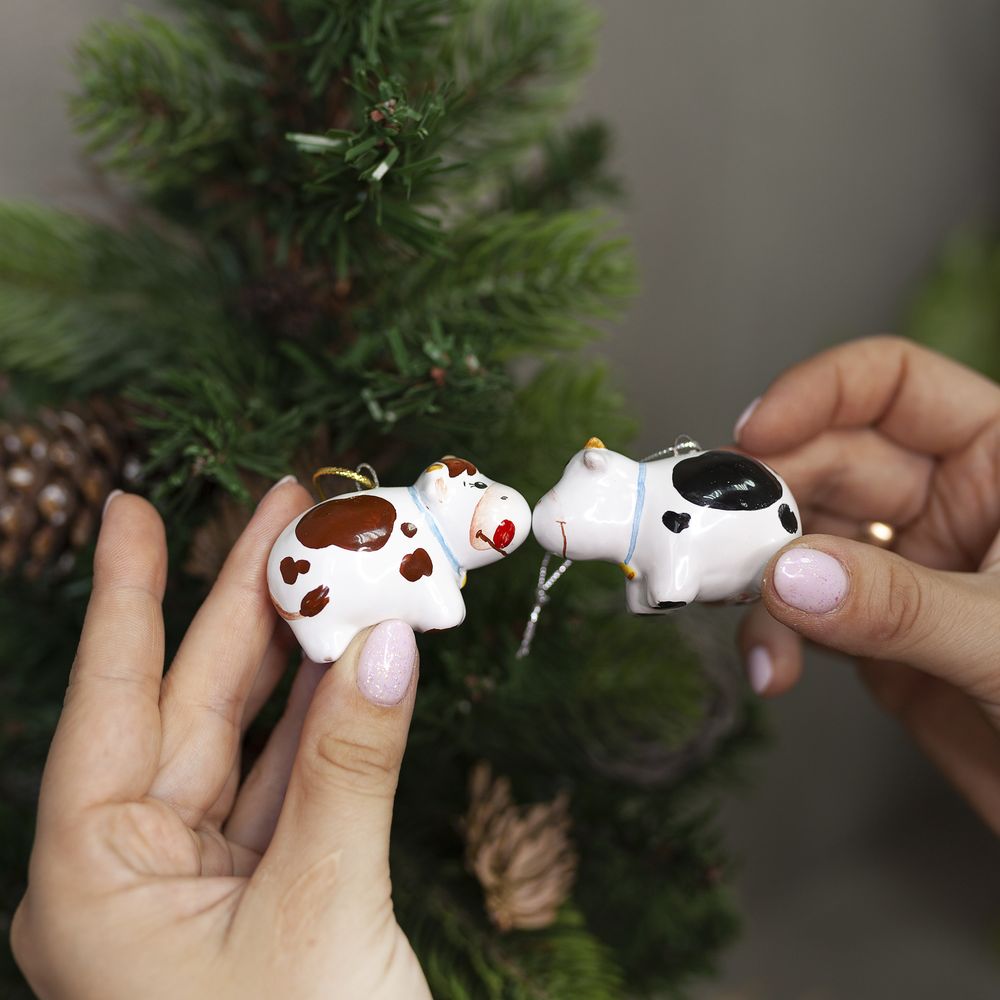 Мини-подвес “”Коровка”” изготовлен в технике майолика, украшен ручной художественной росписью и входит в коллекцию украшений “”Для маленькой ёлочки””. Это обаятельная пятнистая буренка – символ удачи и достатка на работе и в семье. Она станет прекрасным украшением для новогодней ёлочки и символичным подарком для близких и друзей. Буренка – запоминающийся подарок как на Новый год и Рождество, так и для ценителей и коллекционеров изделий ручной работы.”