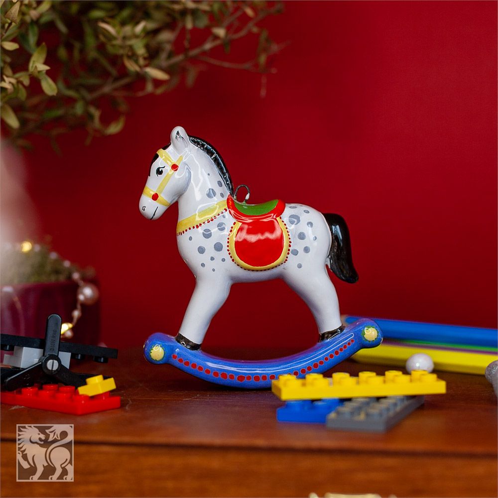 Данное изделие ручной работы входит в коллекцию Символы Года и представляет подвес в виде фигурки игрушечной лошадки- качалки. Всю историю человечества лошади были постоянными спутниками в жизни человека. Лошадь символизирует интеллект, мудрость, ум, рассудок, знатность, свет, проворство, быстроту мысли и бег времени. Конь – также символ упорства, которое помогает добиваться различных целей, поэтому его образ часто по фен-шуй используется при обустройстве жилых или рабочих помещений. Кроме того, по восточному календарю, лошадь – это ещё, и один из символов года. Фигурка лошадки-качалки будет особенным акцентом в интерьере, ярким украшением новогодней композиции и замечательным подарком людям, рожденным под этим знаком, или всем – к Новому году и Рождеству, особенно в год Лошади.