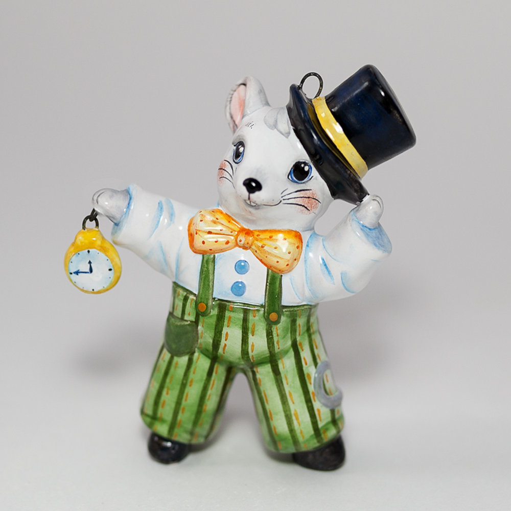 Данное изделие ручной работы представляет фигурку экстравагантного мышонка в цилиндре. Именно это животное начинает цикл Восточного календаря. Фактически в соревновании мышь (крыса) опередила всех других зверей, которые значительно превосходили ее размером и силой, доказала на практике как важно стратегическое мышление, терпение и действия, совершаемые вовремя. Мышь считают символом индивидуализма, работоспособности и продуктивности, символом семейственности, символом инвестиций. Фигурка мыши будет особенным акцентом в интерьере. Мышь принесет удачу, достаток, будет ярким украшением новогодней елочки и замечательным подарком людям, рожденным под этим знаком, или всем – к Новому году и Рождеству, особенно в год Мыши.