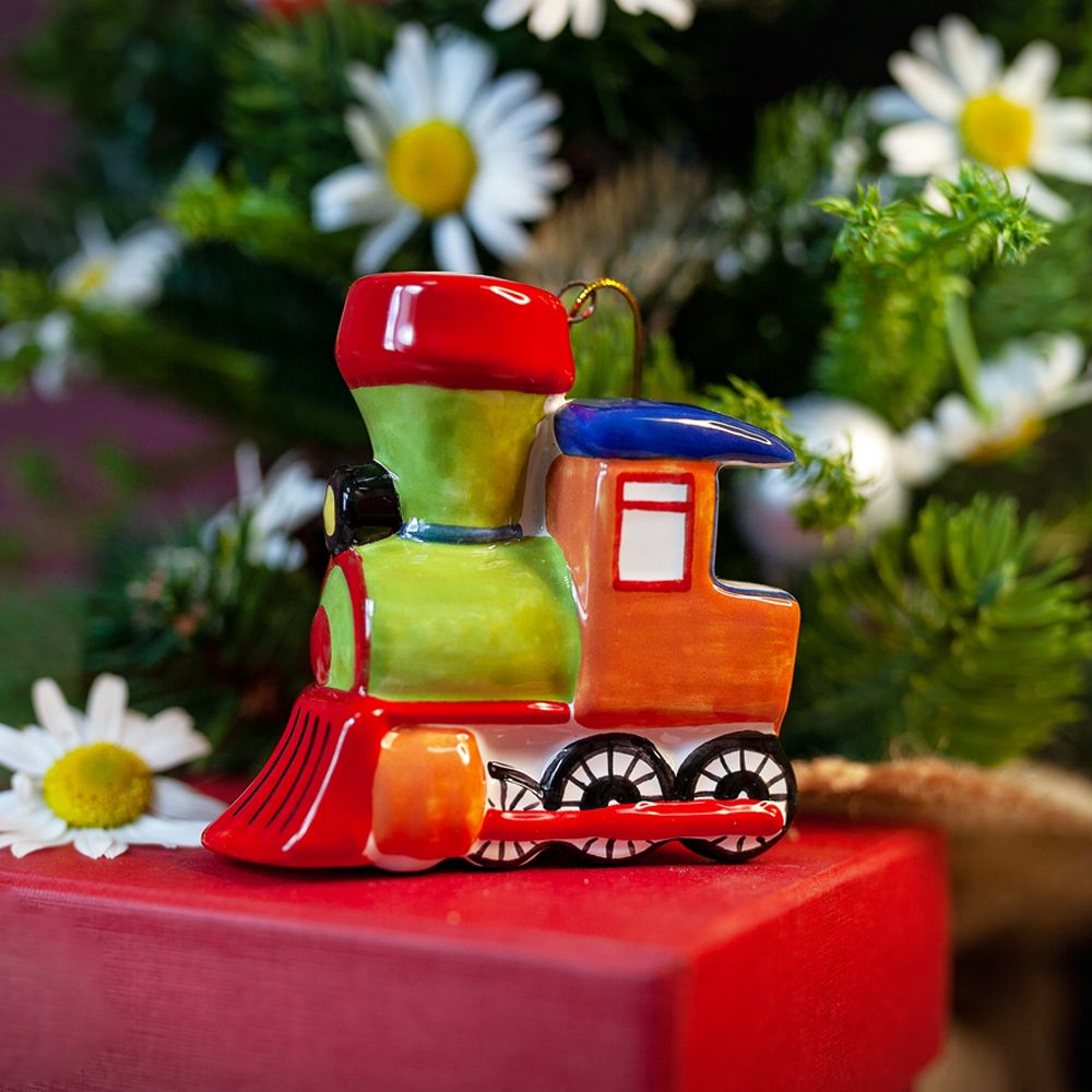Это изделие ручной работы представляет елочный подвес в виде паровозика с оранжевой кабиной. Яркая игрушка обладает шармом и притягательностью, контрастным сочетанием цветов. Паровоз замечательно украсит зеленую елочку, станет прекрасным подарком на Новый год, а также на любой другой праздник, порадует коллекционеров.