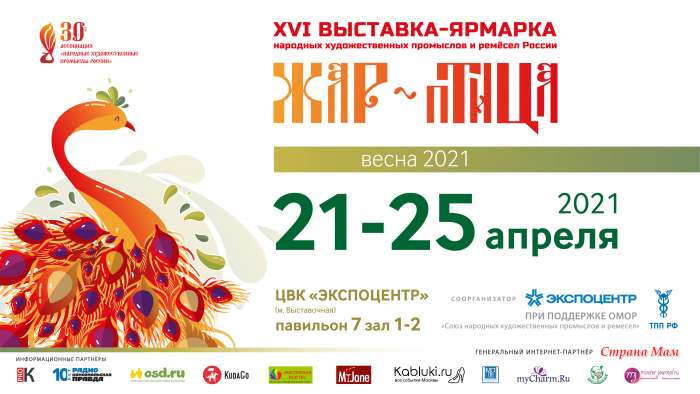 XVI Выставка-ярмарка народных художественных промыслов и ремёсел «ЖАР-ПТИЦА. Весна-2021» пройдёт с 21 по 25 апреля 2021 года в павильоне №7 (залы 1-2) ЦВК «ЭКСПОЦЕНТР», г.Москва, при поддержке ОМОР «Союз народных художественных промыслов и ремесел».
