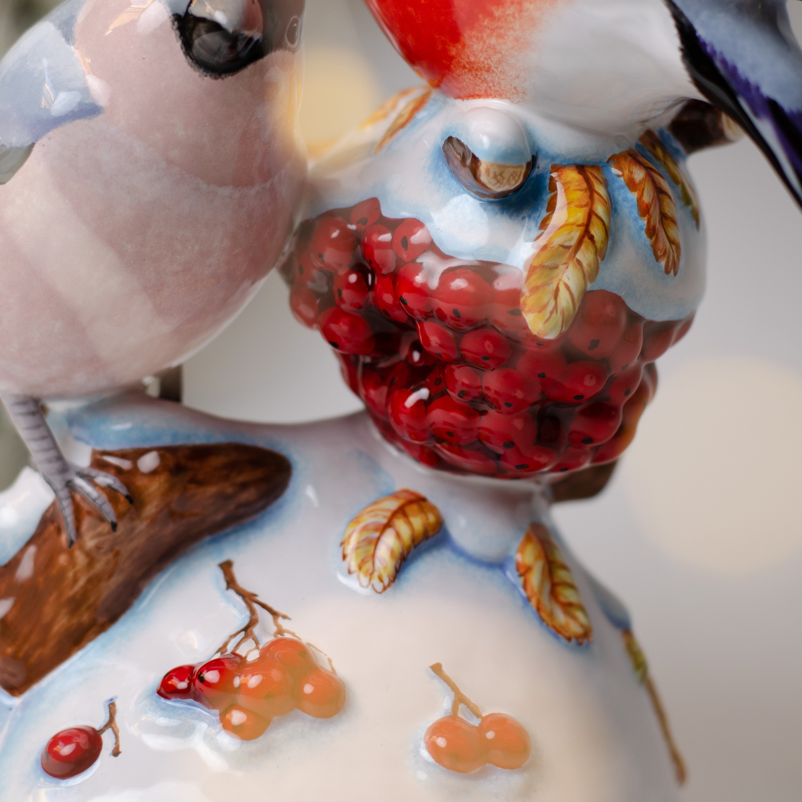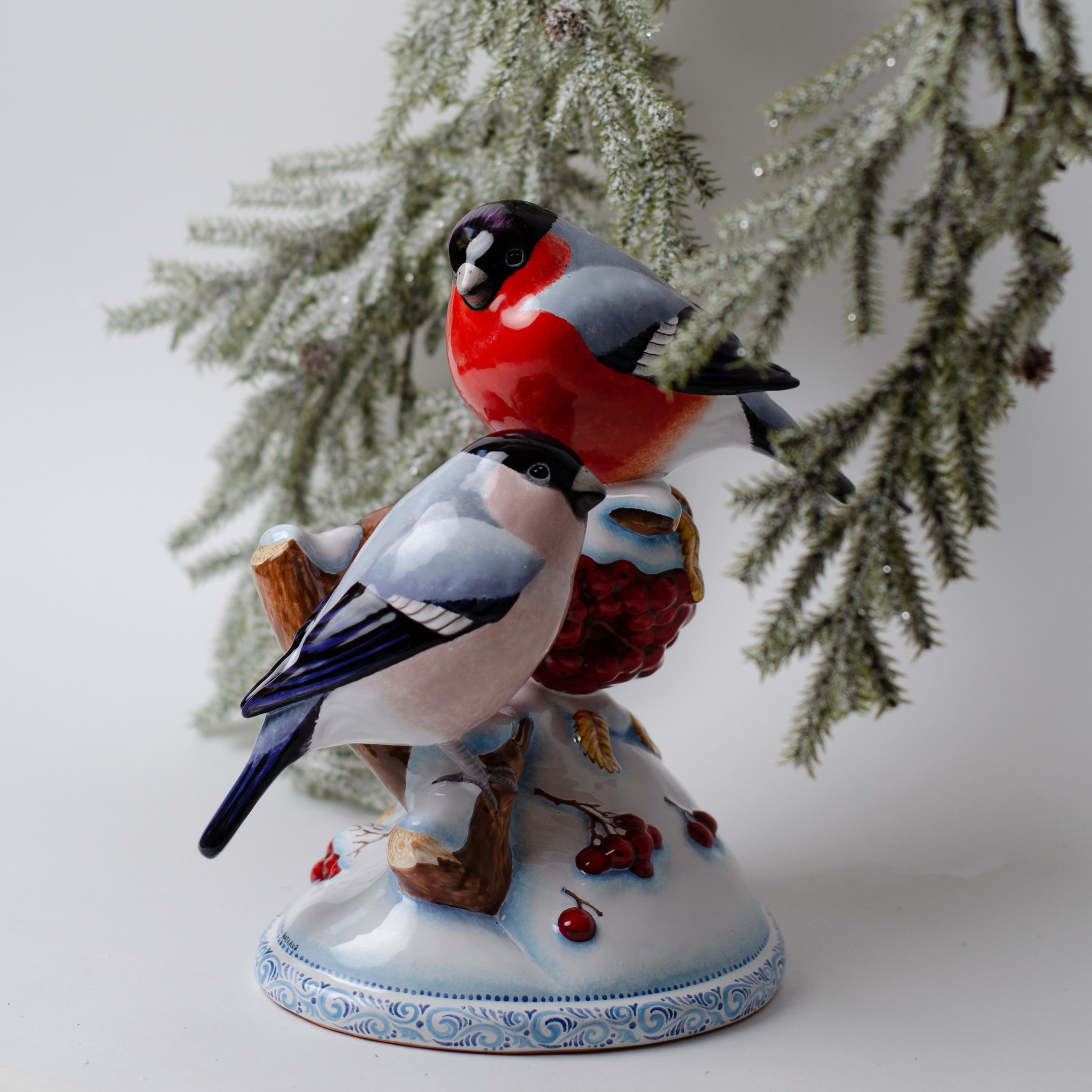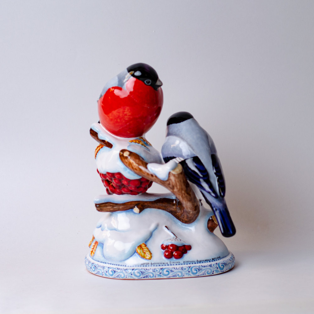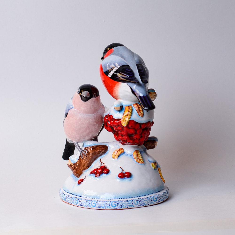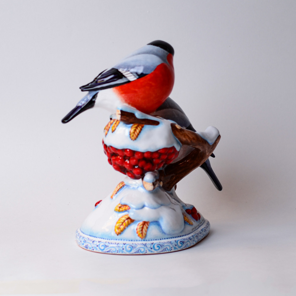 Изделие представляет композицию из двух красногрудых снегирей, сидящих на заснеженной ветке рябины. Яркая палитра красок так и притягивает взгляд. Композиция смотрится очень эффектно, она внесет завораживающую изюминку в интерьер, станет замечательным подарком родным, близким или тем, кому вы хотите передать положительные эмоции и радость, порадует коллекционеров.
