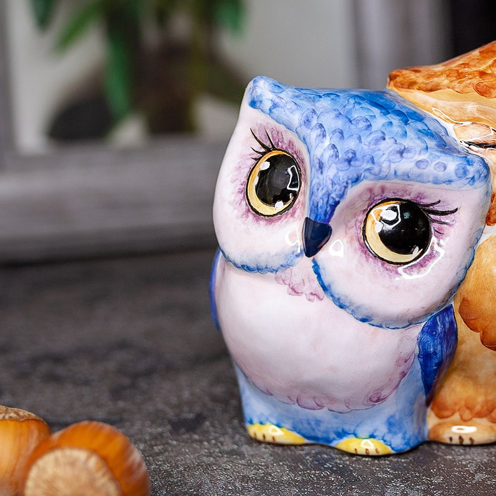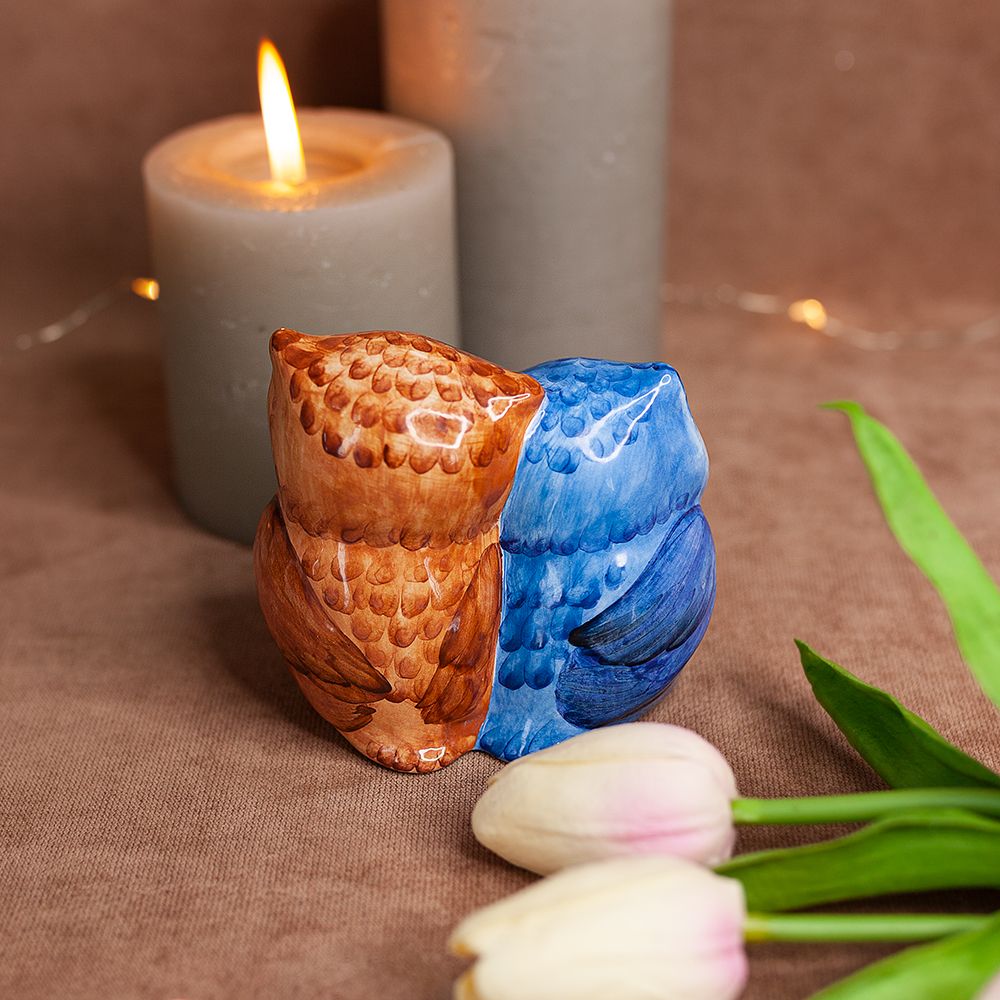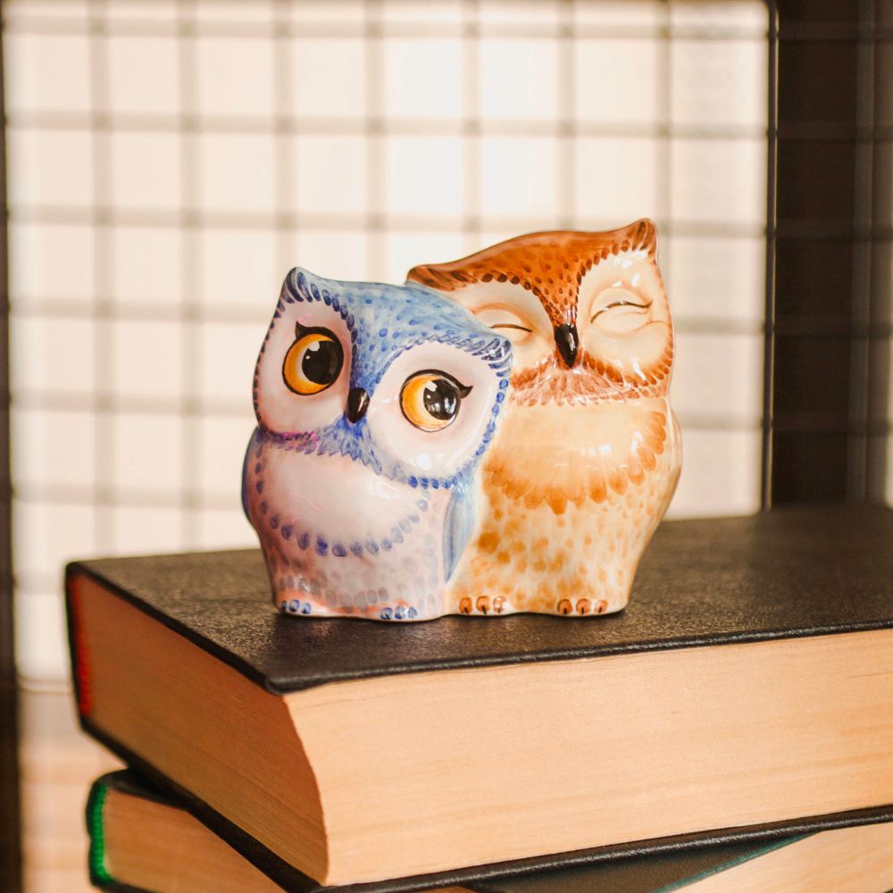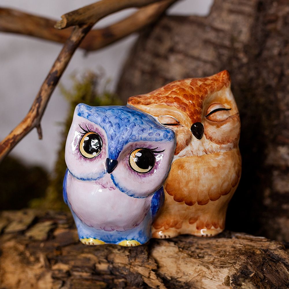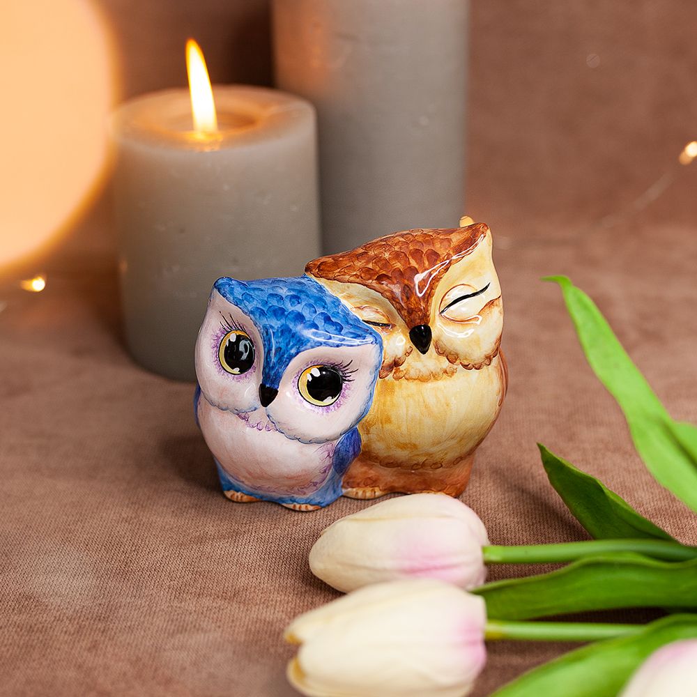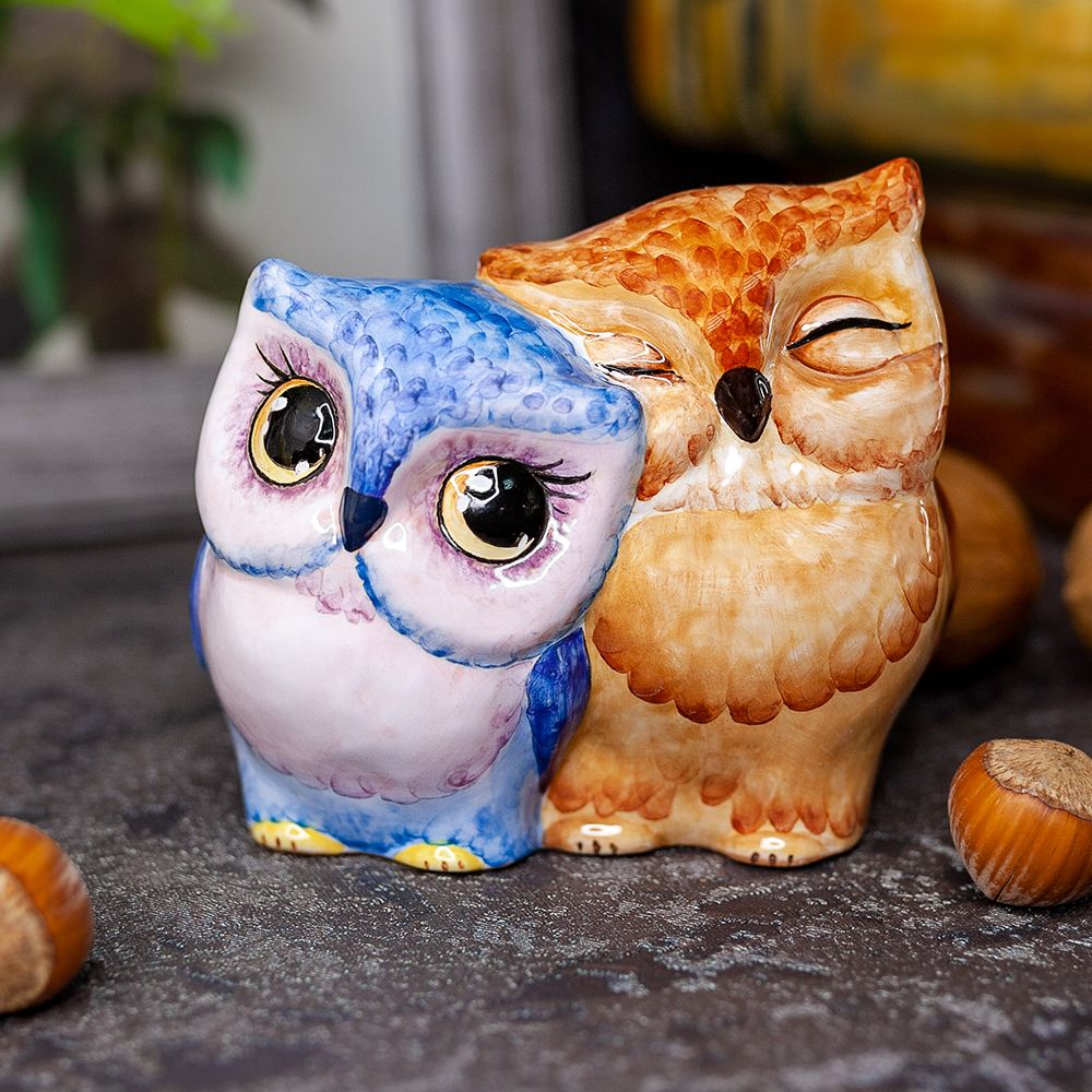 Парная фигурка “Совушки” выполнена в технике майолика и украшена ручной художественной росписью. Совы – символ мудрости и защиты дома от темных сил. В древности она считалась талисманом богатства и духом-хранителем кладов. Считается, что сова может направить на правильный путь и принять верное решение. А еще эти фигурки невероятно милые и однозначно не могут жить друг без друга. Фигурка прекрасно подойдет для украшения детской комнаты и символичным акцентом в интерьере дома. Они могут быть прекрасным подарком для тех, кто верит в символику и магию, и ценит уникальные и ручные изделия. Фигурка станет замечательным подарком для коллекционеров, любителей животных или просто тех, кто ценит уникальные и ручные изделия.