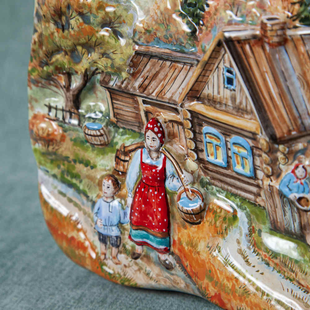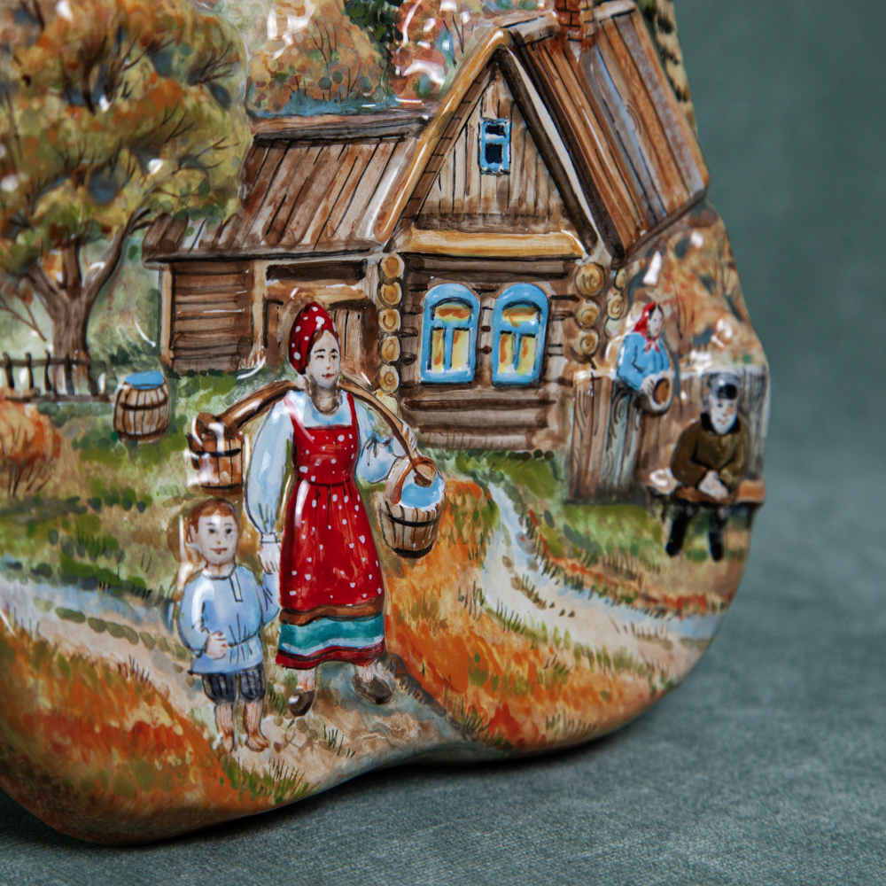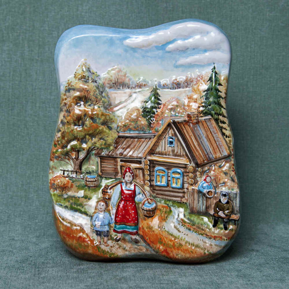 Рельеф “”Деревенская осень (малая с бабой)”” изготовлен в технике майолика и украшен ручной художественной росписью. Мастером очень тонко изображена жизнь русской деревни – самобытные жители и их повседневный быт, маленький деревянный домик за околицей, речка вдалеке, в обрамлении желтых полей и деревьев – тихая прелесть осеннего пейзажа. Каждая деталь и фигура на изделии, заставляет задуматься и воссоздает образы повседневной жизни нашего народа. Этот керамический рельеф станет не только прекрасным украшением для интерьера, но и настоящим произведением искусства, которое будет радовать и вдохновлять своего владельца каждый день. Благодаря своей уникальности и характеру, это изделие станет превосходным подарком для настоящего ценителя искусства и традиций.”