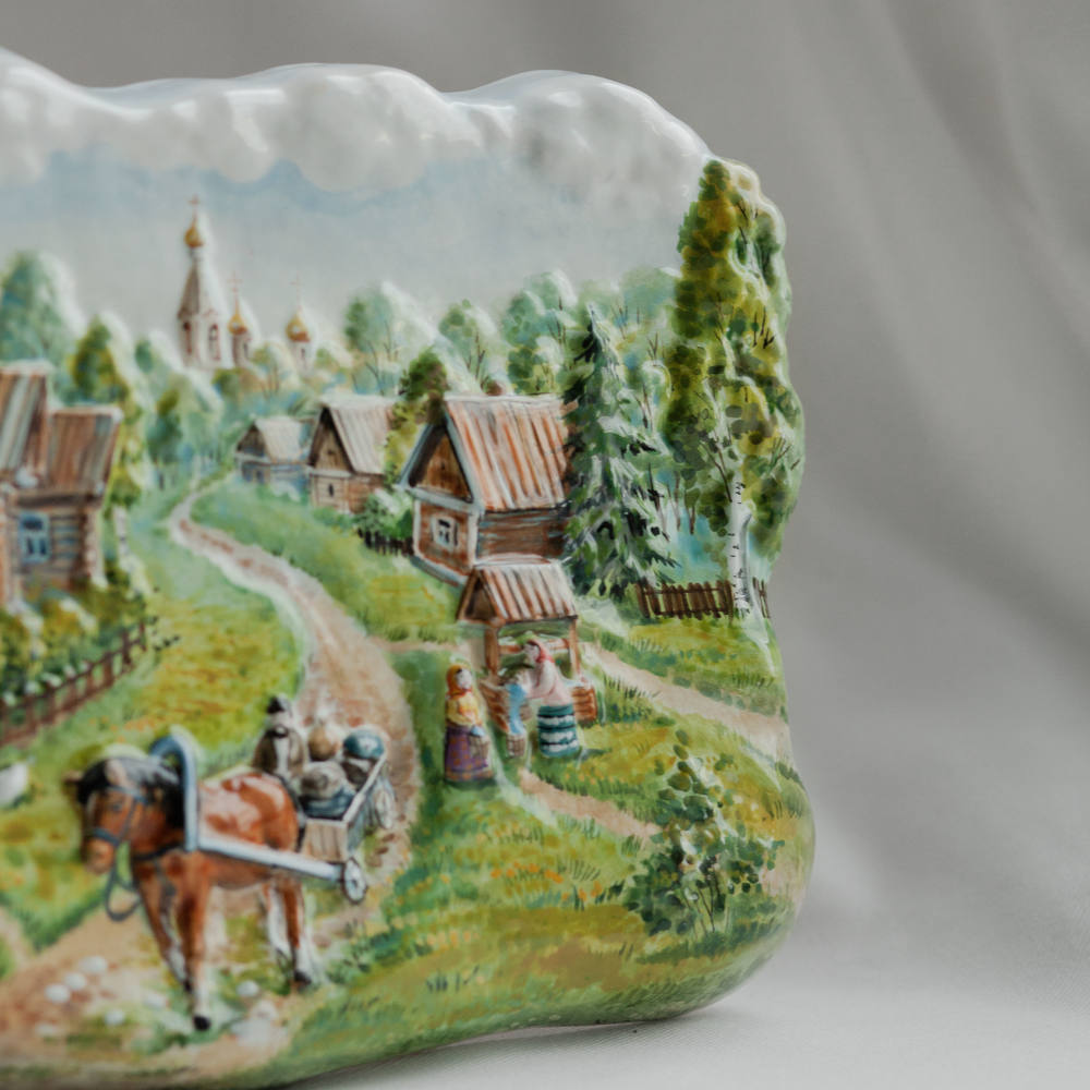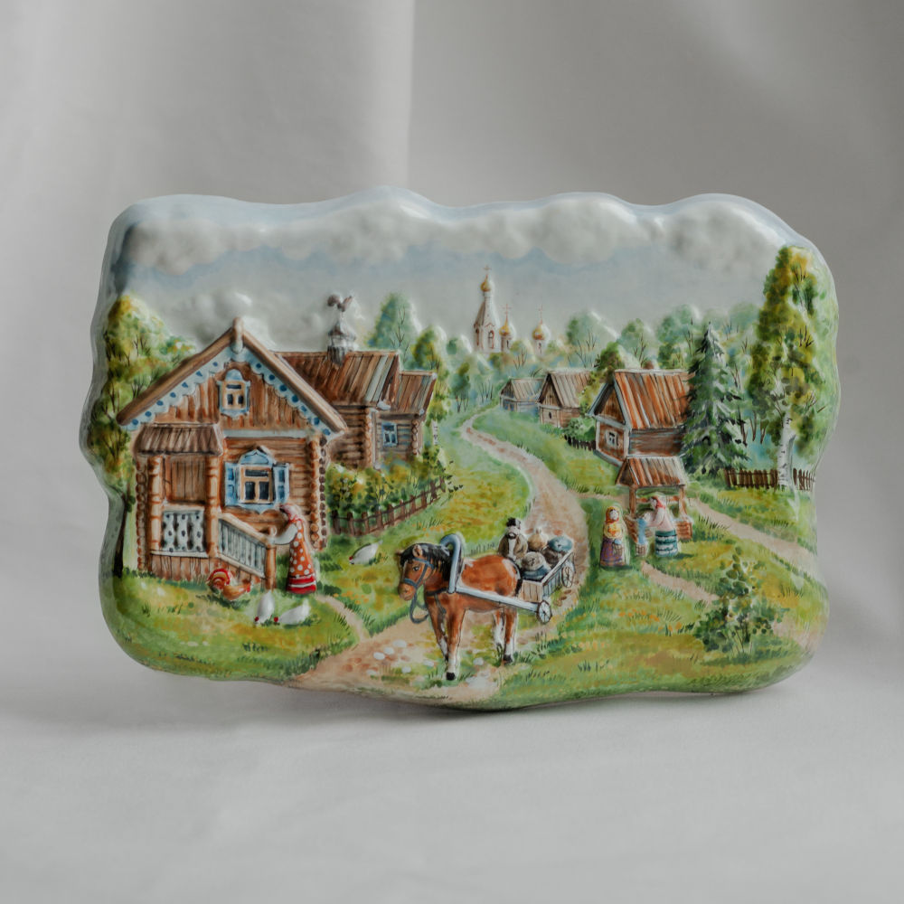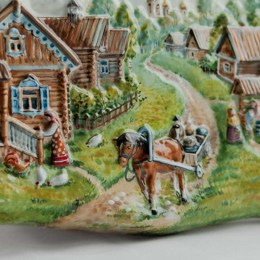 Рельеф “Деревенская жизнь, лето” изготовлен в технике майолика и украшен ручной художественной росписью. Мастером очень тонко изображена жизнь русской деревни, ее деревянные домики, маковки церкви вдалеке и неспешная “суета” деревенских жителей, которые живут в гармонии с природой, ее ритмами и законами.Тонкая проработка деталей и мастерство художественной росписи создают иллюзию присутствия в этом уютном и тихом мире. Смотря на это произведение искусства, словно ощущаешь запах дыма от печи и слышишь звук лошадиных подков на дороге и аромат луговых трав. Керамический рельеф станет не только украшением интерьера, но и эффектным акцентом, который привлечет восхищенные взгляды гостей. Благодаря своей красоте и уникальности, он подчеркнет тонкий вкус хозяина и станет прекрасным подарком для коллекционеров и любителей изделий ручной работы.