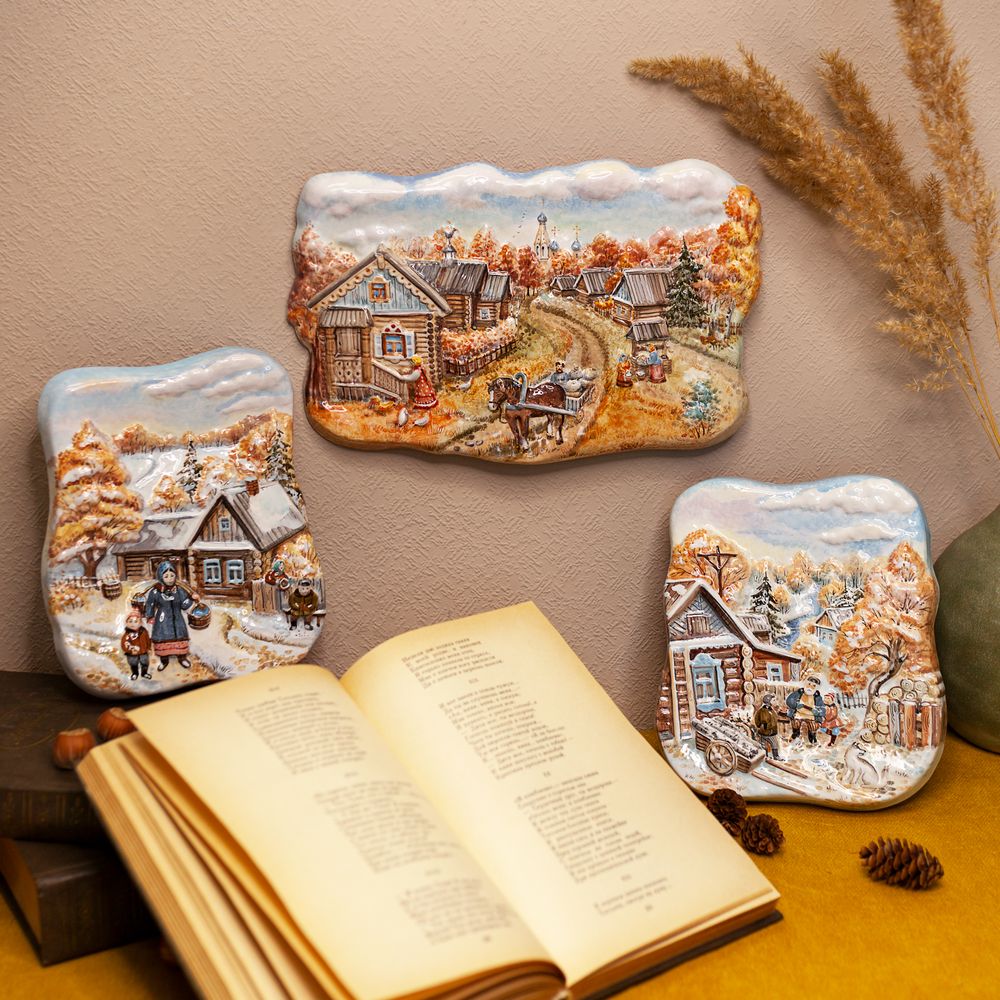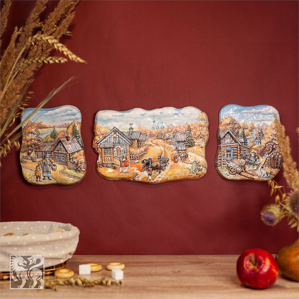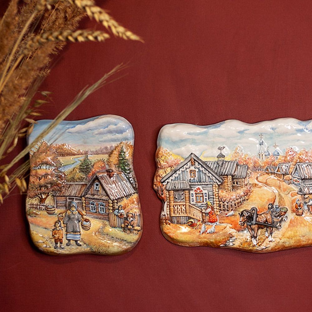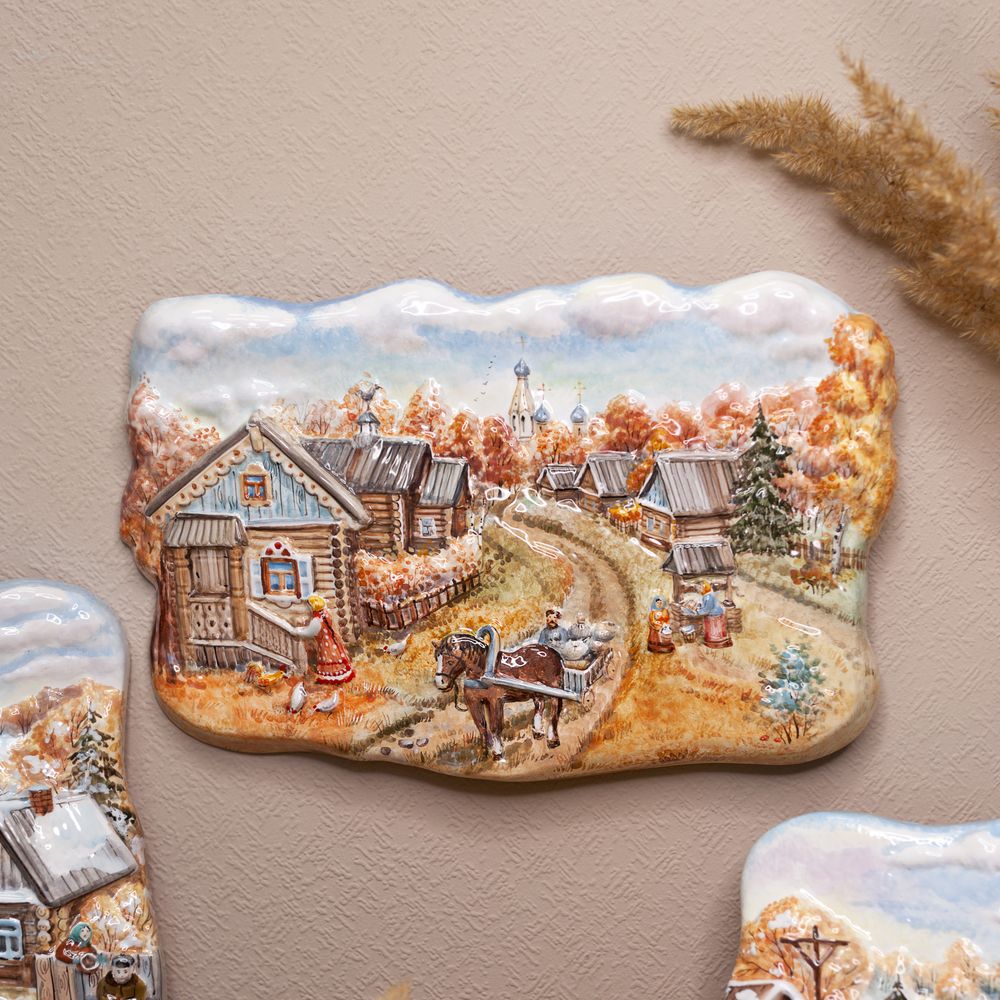 Рельеф “”Деревенская жизнь, осень”” изготовлен в технике майолика и украшен ручной художественной росписью. Мастером очень тонко изображена жизнь русской деревни, ее деревянные домики, маковки церкви вдалеке и неспешная “”суета”” деревенских жителей, которые живут в гармонии с природой, ее ритмами и законами.Тонкая проработка деталей и мастерство художественной росписи создают иллюзию присутствия в этом уютном и тихом мире. Смотря на это произведение искусства, словно ощущаешь запах дыма от печи и слышишь звук лошадиных подков на дороге и шорох сухой травы на ветру. Керамический рельеф станет не только украшением интерьера, но и эффектным акцентом, который привлечет восхищенные взгляды гостей. Благодаря своей красоте и уникальности, он подчеркнет тонкий вкус хозяина и станет прекрасным подарком для коллекционеров и любителей изделий ручной работы.”