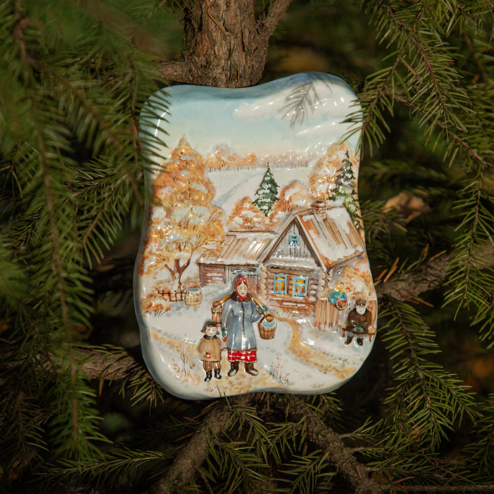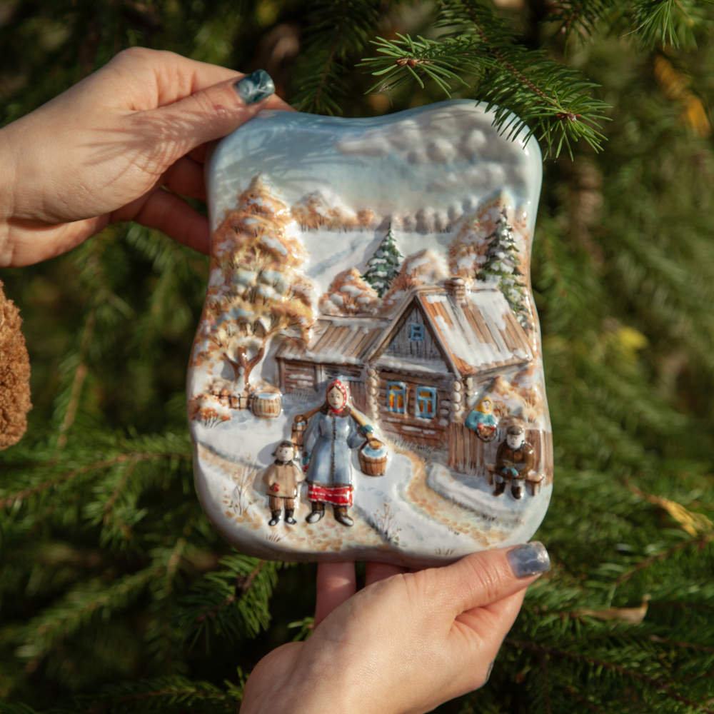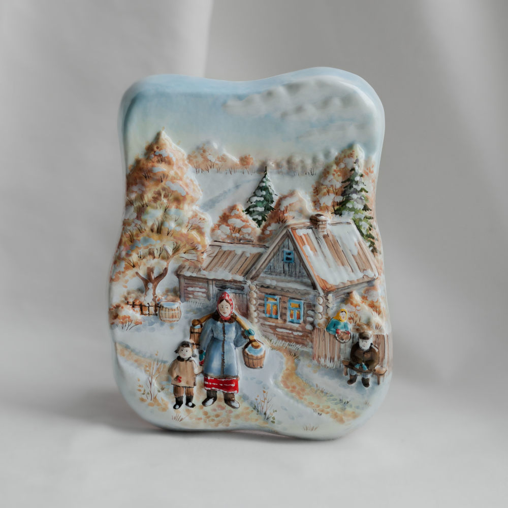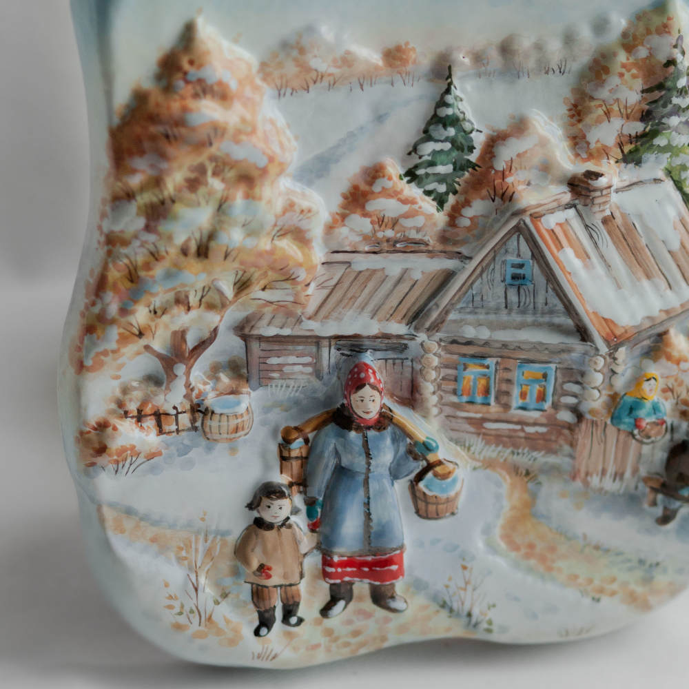 Рельеф “Деревенский первый снег (малая с бабой)” изготовлен в технике майолика и украшен ручной художественной росписью. Мастером очень тонко изображена жизнь и быт русской деревни – дом с резными наличниками на окнах, телега, поленница дров, собака во дворе, женщина с ребенком несут воду из колодца, выпал первый снежок. Каждая деталь и фигура на изделии, заставляет задуматься и воссоздает образы повседневной жизни нашего народа. Этот керамический рельеф станет не только великолепным украшением для интерьера, но и настоящим произведением искусства, которое будет радовать своего владельца душевным теплом и ностальгией за прошлыми временами. Он станет уникальным подарком, который подчеркнет изысканный вкус и внимательное отношение к традициям и наследию.