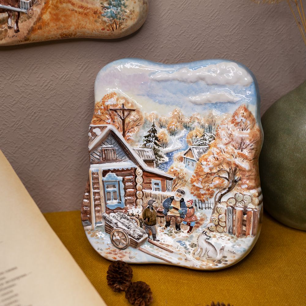 Рельеф “Деревенский первый снег (малая с дедом)” изготовлен в технике майолика и украшен ручной художественной росписью. Мастером очень тонко изображена жизнь и быт русской деревни – дом с резными наличниками на окнах, телега, поленница дров, собака во дворе, на лавочке дед с внуками о чём-то ведут беседу, выпал первый снежок. Каждая деталь и фигура на изделии, заставляет задуматься и воссоздает образы повседневной жизни нашего народа. Этот керамический рельеф станет не только великолепным украшением для интерьера, но и настоящим произведением искусства, которое будет радовать своего владельца душевным теплом и ностальгией за прошлыми временами. Он станет уникальным подарком, который подчеркнет изысканный вкус и внимательное отношение к традициям и наследию.