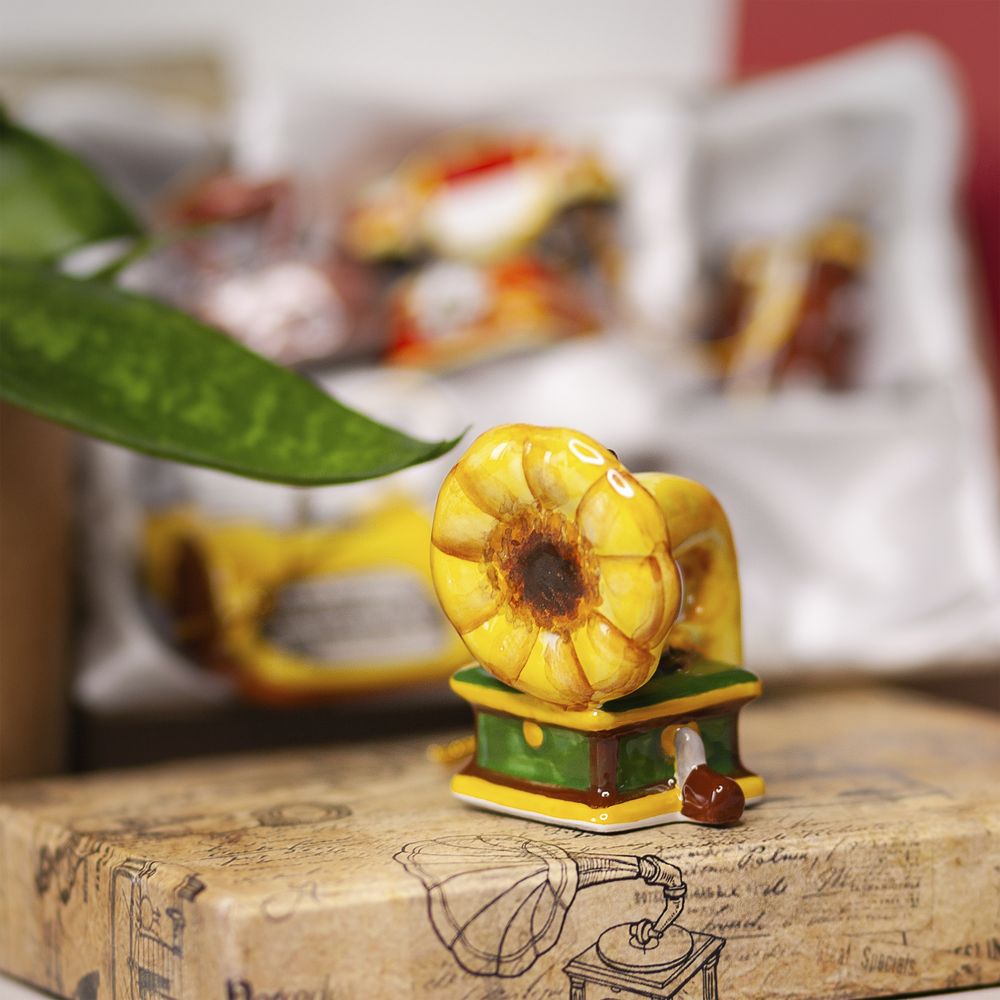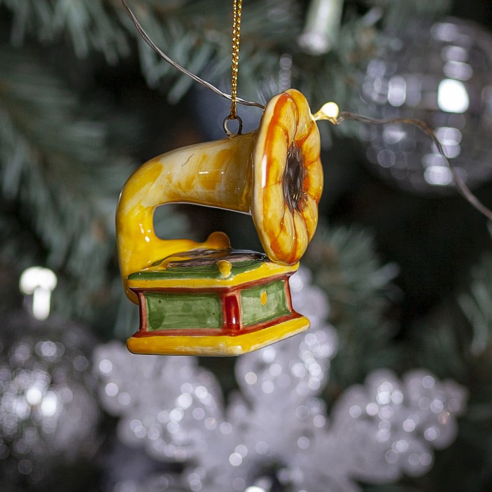 Подвес “”Граммофон”” изготовлен в технике майолика, украшен ручной художественной и входит в набор ёлочных украшений “”Ретроштучки””. Граммофон – символ музыкальной классики, яркий и стильный аксессуар, который создаст атмосферу прошлого и внесет нотку ретро в праздничное убранство. Этот подвес не только оригинальное украшение для елочки, но и станет прекрасным подарком на Новый год или любой другой праздник для коллекционеров и ценителей уникальных ретро-вещей.”