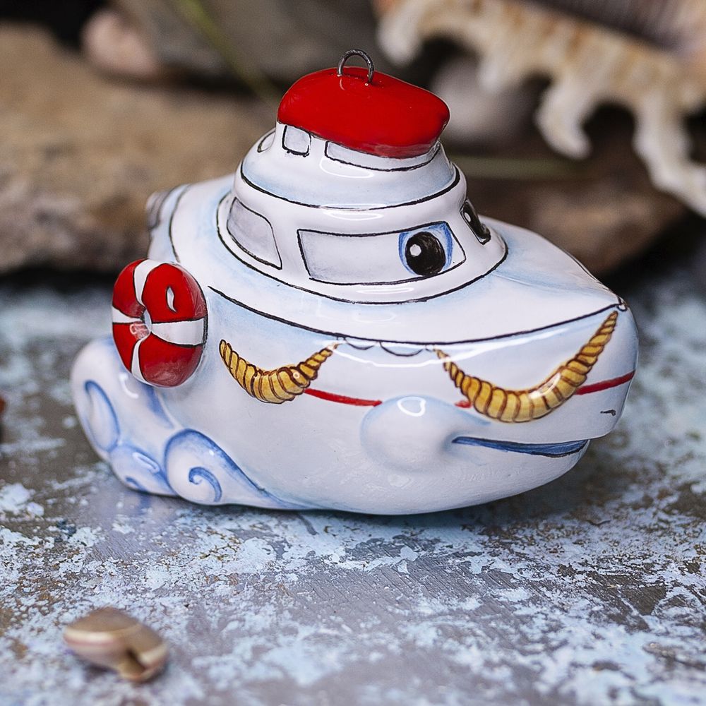 Это изделие ручной работы входит в коллекцию “Весёлый транспорт”. Кто же из мальчишек не мечтал о море и путешествиях? Забавный улыбчивый Катерок украсит любую ёлочку. Станет чудесным подарком на день рождения, 23 февраля, Новый год или любой другой праздник. Порадуйте своего непоседу и соберите всю коллекцию ярких и смешных фигурок.