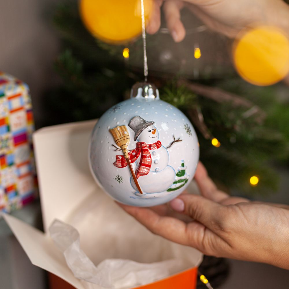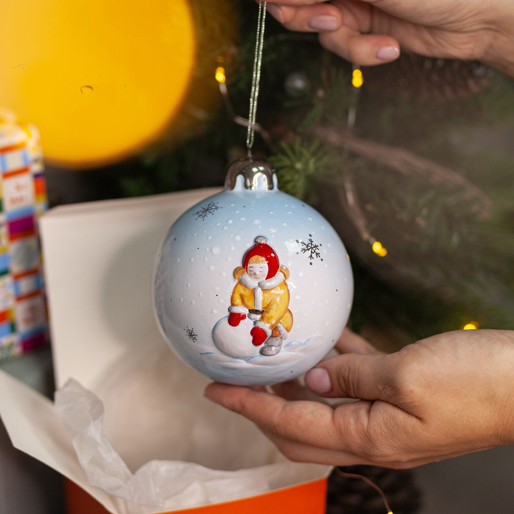 Эксклюзивное изделие ручной работы представляет собой шар с рельефным изображением с одной стороны веселого снеговика в ярком шарфе и с метлой в руке, с другой – девочку, в меховой шубке, в красных варежках и шапке, которая катает большой снежный ком, чтобы лепит снежную бабу. Шар смотрится очень эффектно, а позолота добавляет выразительности. Такие шары будут изысканно смотреться как на самой новогодней ели, так и в гирляндах, украшающих двери, лестницы, и, конечно в праздничных композициях. Они создадут настроение, добавят волшебного очарования и магии любому интерьеру, будут незабываемым подарком к Новому году и Рождеству, который будет оценен по достоинству и подчеркнет вкус дарителя.