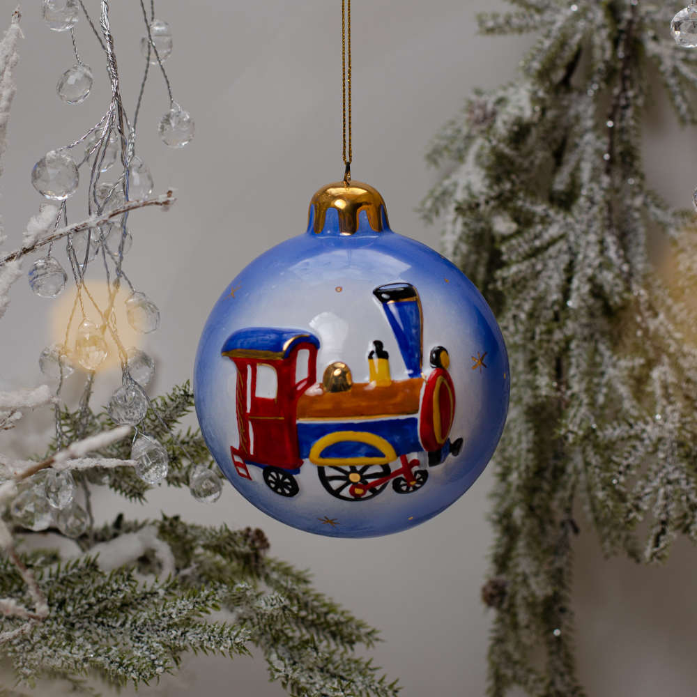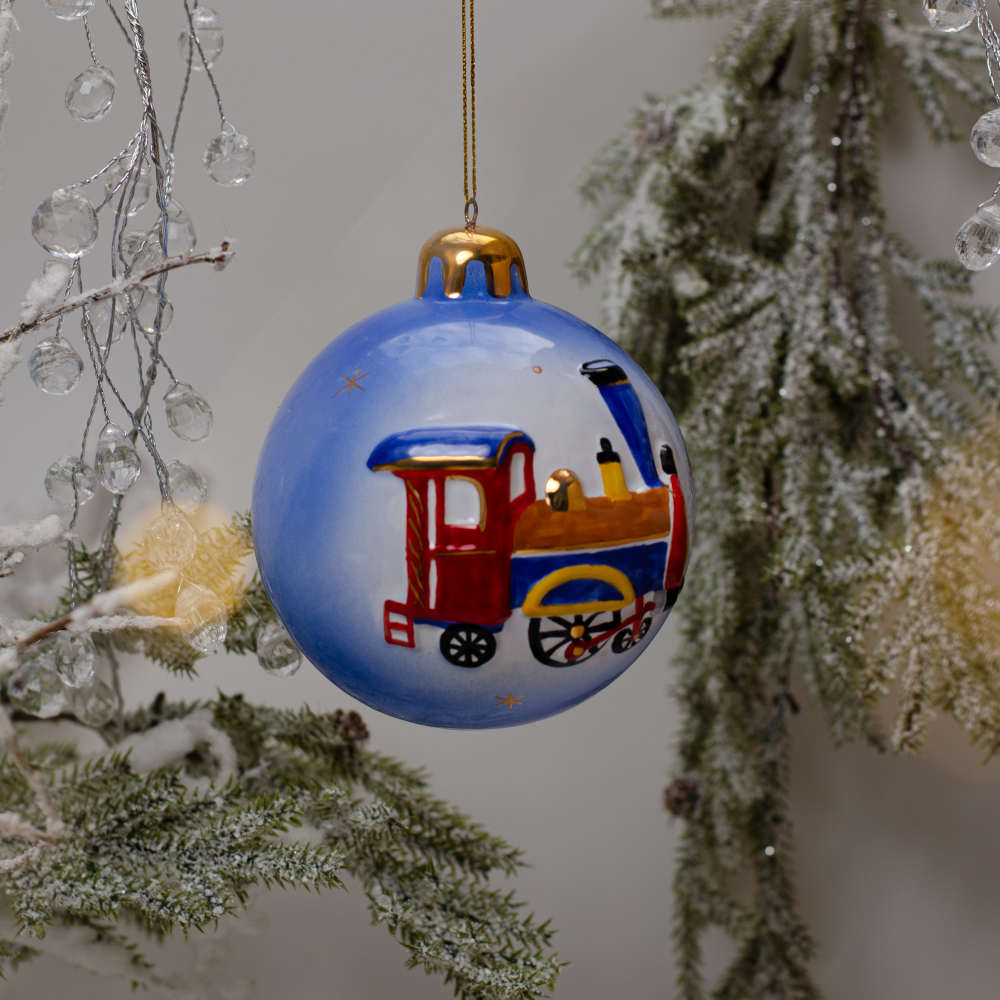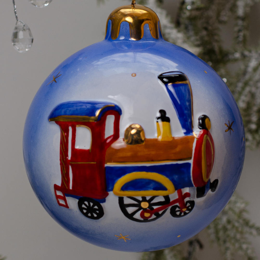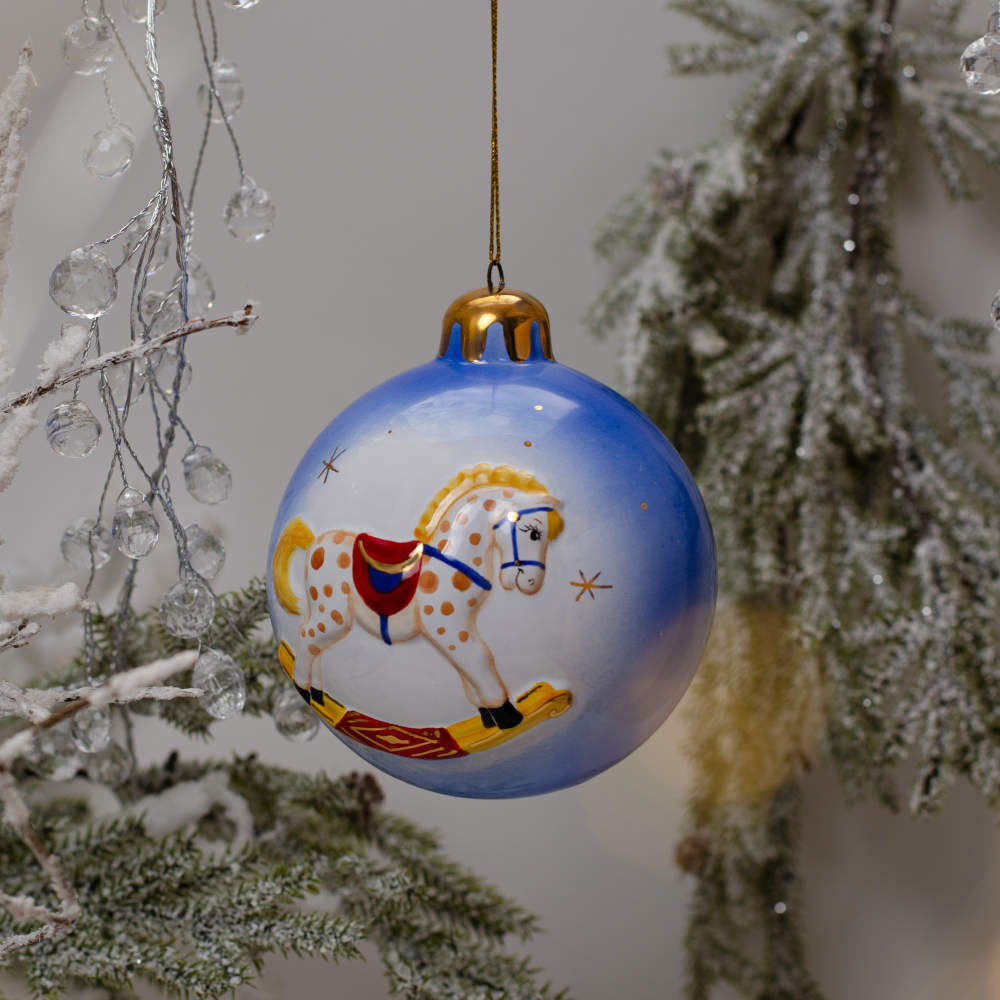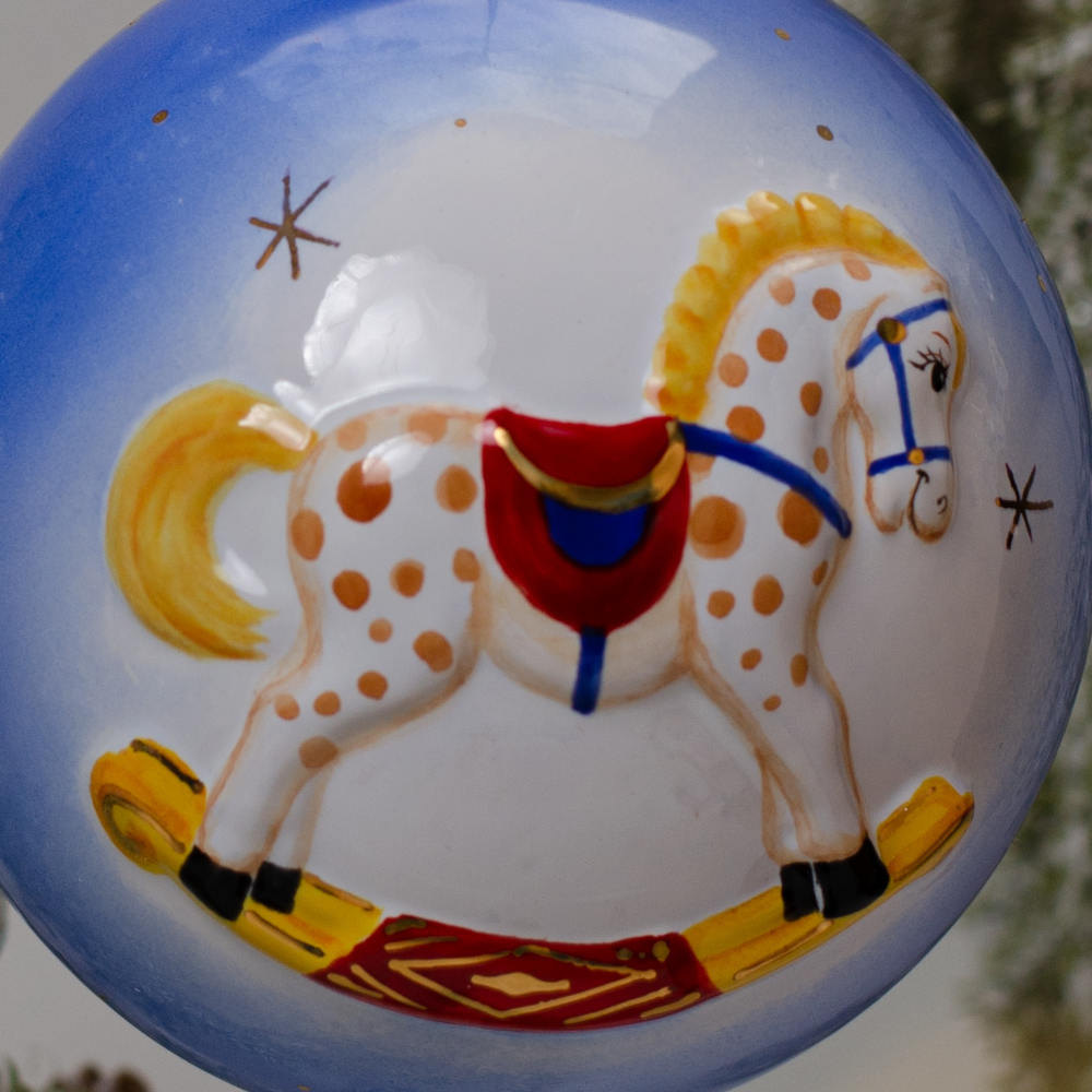 Ёлочный шар выполнен в технике майолика и украшен ручной художественной рописью, с рельефным изображением лошадки-качалки “в яблоках” и игрушечного паровоза. Изображения игрушек эффектно выделяются на голубом фоне, а позолота добавляет изысканности изделию. Шары с ретро-игрушками станут прекрасным украшением для новогодней елки, создадут ностальгическую атмосферу, навевая добрые детские воспоминания. Изделия будут прекрасно смотреться в елочных гирляндах и композициях, а также станут прекрасным подарком к Новому году и Рождеству.