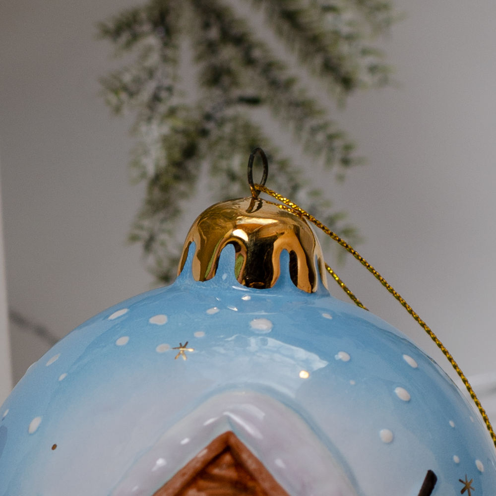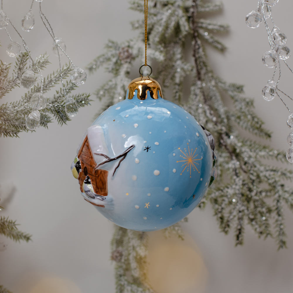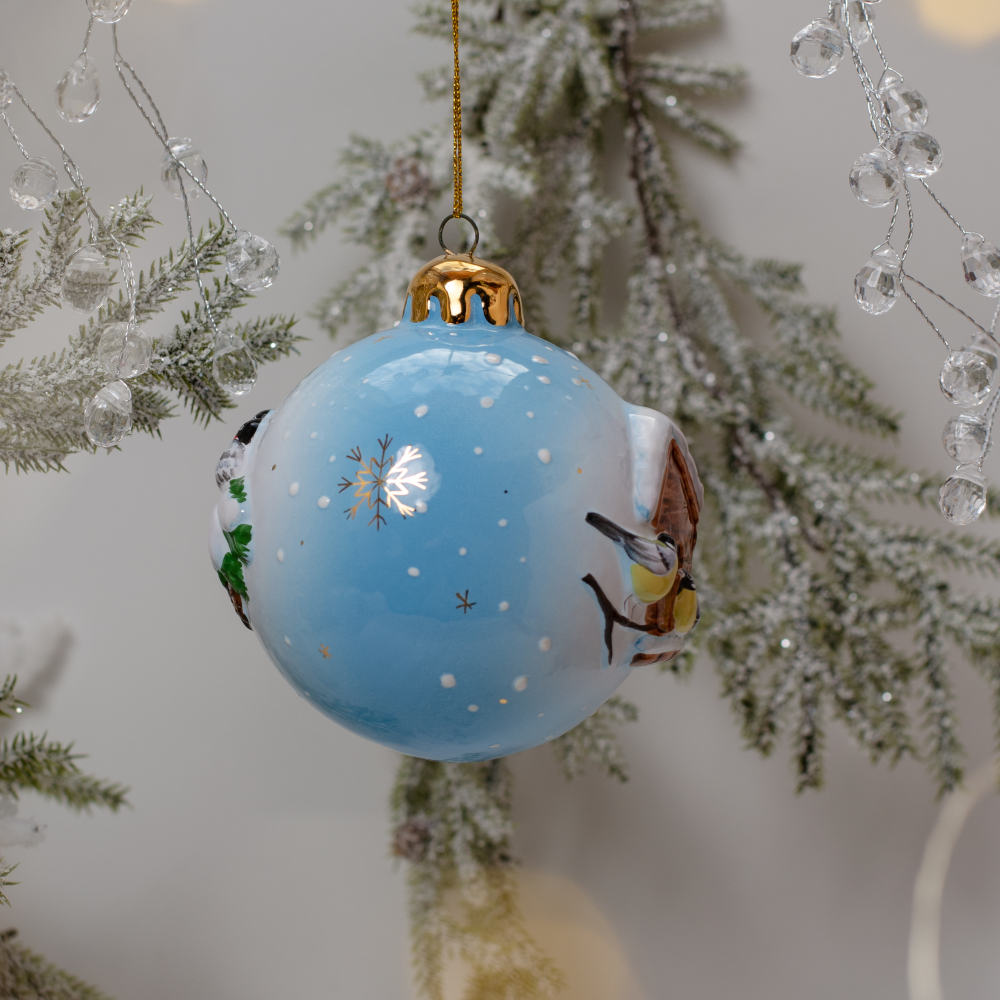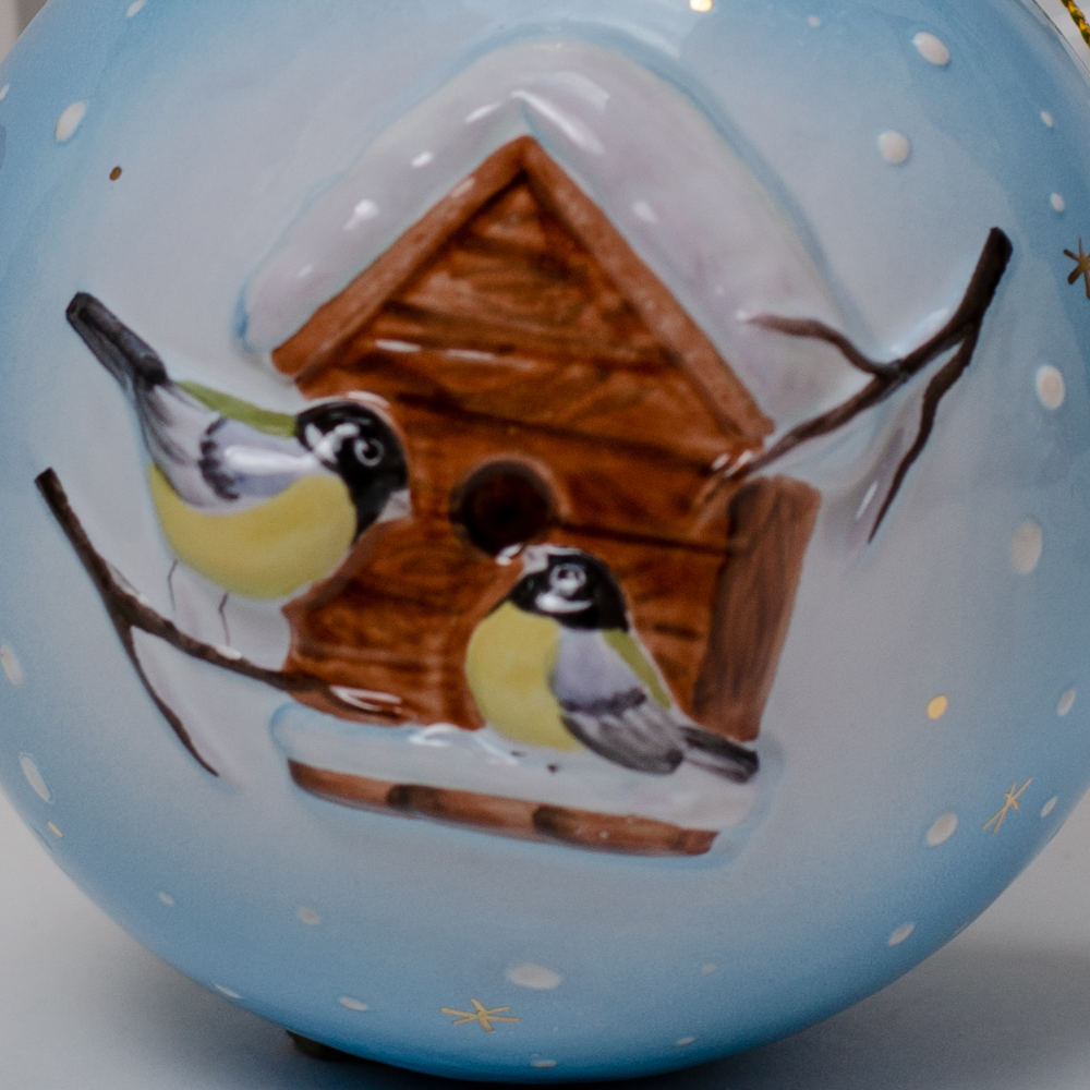 Эксклюзивное изделие ручной работы представляет собой шар с рельефным изображением с одной стороны – бойких синичек около скворечника, а с другой – пары красногрудых снегирей, устроившихся на заснеженной еловой ветке. Обе пары птиц смотрятся ярко и эффектно на фоне голубого зимнего неба с медленно спускающимися снежинками, а позолота добавляет выразительности. Такие шары будут изысканно смотреться, как на самой новогодней ели, так и в гирляндах, украшающих двери, лестницы, и, конечно в праздничных композициях. Они создадут настроение, добавят волшебного очарования и магии любому интерьеру, будут незабываемым подарком к Новому году и Рождеству, который будет оценен по достоинству и подчеркнёт вкус дарителя.
