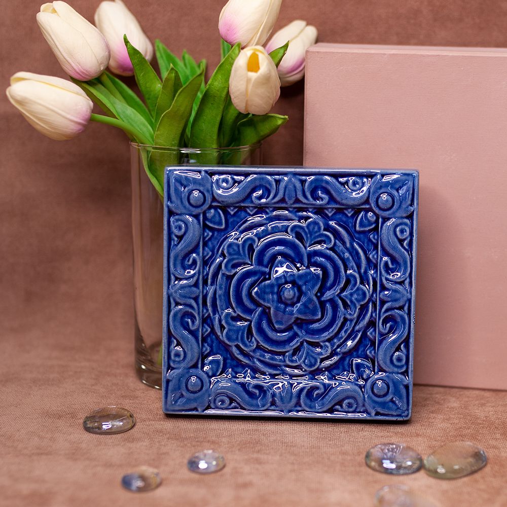 Изделие представляет керамический рельефный элемент квадратной формы, покрытый синей глазурью, на котором нанесено стилизованное изображение чертополоха. На Руси отношение к чертополоху всегда было почтительным и мистическим. Это уже видно по названию растения: оно складывается из общеславянских корней “черт” и “полох” (пугать). Магическое значение чертополоха в том, что это сильный оберег, защищающий от опасностей, плохих знакомств, дурного влияния и нечистой силы. Цвет, выбранный для изразца, придает дополнительную смысловую нагрузку изделию, поскольку синий цвет символизирует воду – живительную влагу, без которой нет жизни на Земле. Данное изделие может быть использовано как изразец, и как самостоятельный настенный декор. При этом смотрится ярко и эффектно, может использоваться в местах, где фантазия архитектора или дизайнера по интерьеру не ограничивается типовым решением, он позволяет сделать акцент, привлекающий взгляд, внести завораживающую изюминку в интерьер. Изразец также будет прекрасным подарком родным, близким, коллегам по работе.