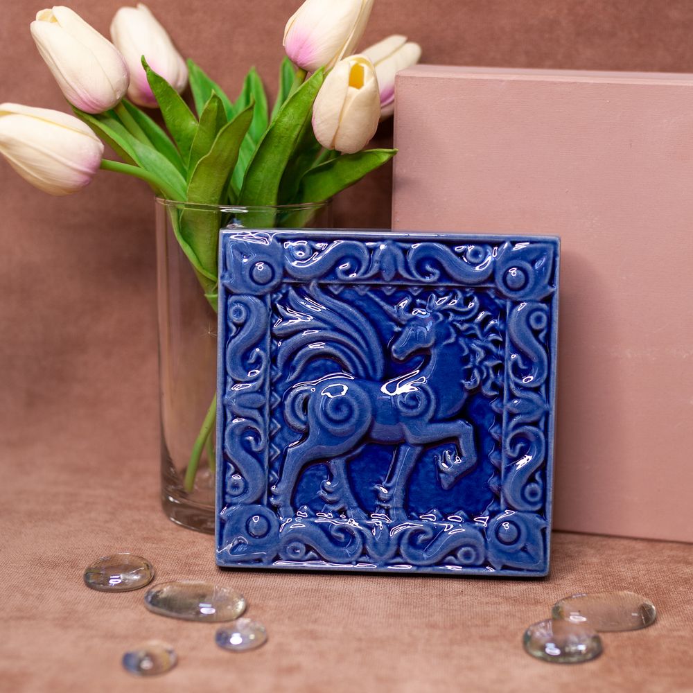 Изделие представляет керамический рельефный элемент квадратной формы, покрытый синей глазурью, на котором нанесено стилизованное изображение Единорога, создания света, несущего добро, призванное противостоять темным силам, бороться с монстрами и чудовищами. Единорог — это мост между Небом и Землей, между миром светлых принципов и миром темной и плотной материи, проявленного и непроявленного. Единорог является символом пробужденного сознания, целостности и внутреннего покоя, он просвещает, светит в темноте и, подобно утренней звезде, указывает путь, вдохновляя людей в поисках мудрости. Его рог символизирует возможность проникновения Духа в Материю. Выбранный цвет изразца придает дополнительную смысловую нагрузку изделию, поскольку синий цвет символизирует воду – живительную влагу, без которой нет жизни на Земле. Данное изделие может быть использовано как изразец, и как самостоятельный настенный декор. При этом смотрится стильно и эффектно, может использоваться в местах, где фантазия архитектора или дизайнера по интерьеру не ограничивается типовым решением, он позволяет сделать акцент, привлекающий взгляд, внести завораживающую изюминку в интерьер. Изразец также будет прекрасным подарком родным, близким, коллегам по работе.