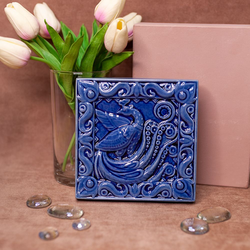 Изделие представляет керамический рельефный элемент квадратной формы, покрытый синей глазурью, на котором нанесено стилизованное изображение красивой и гордой птицы – павлина. Разумеется, такая прекрасная птица как павлин символизирует также красоту и чувства любви и привязанности, поэтому изображение павлина или павлиньи перья часто рекомендуются фен шуй в качестве любовного амулета для одиноких людей, так как помогают найти свою половинку. Также Павлин – это символ изобилия и плодородия, неподкупности и благородства, пёстрого многообразия мира. Выбранный цвет изразца придает дополнительную смысловую нагрузку изделию, поскольку синий цвет символизирует воду – живительную влагу, без которой нет жизни на Земле. Данное изделие может быть использовано как изразец, и как самостоятельный настенный декор. При этом смотрится стильно и эффектно, может использоваться в местах, где фантазия архитектора или дизайнера по интерьеру не ограничивается типовым решением, он позволяет сделать акцент, привлекающий взгляд, внести завораживающую изюминку в интерьер. Изразец также будет прекрасным подарком родным, близким, коллегам по работе.