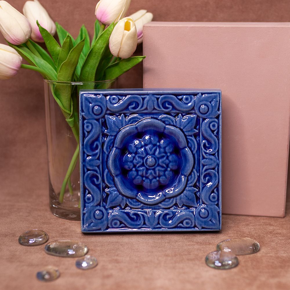 Изделие представляет керамический рельефный элемент квадратной формы, покрытый синей глазурью, на котором нанесено стилизованное изображение солнца. Солнце — источник жизни на нашей планете, поэтому с самой глубокой древности оно являлось прежде всего символом созидательной энергии. Ещё это знак мужского начала, знаний и интеллекта, величия и храбрости. При этом выбранный цвет усиливает символику изделия, поскольку синий цвет символизирует воду – живительную влагу, без которой нет жизни на Земле. Данное изделие может быть использовано как изразец, и как самостоятельный настенный декор. При этом смотрится ярко и эффектно, может использоваться в местах, где фантазия архитектора или дизайнера по интерьеру не ограничивается типовым решением, он позволяет сделать акцент, привлекающий взгляд, внести завораживающую изюминку в интерьер. Изразец также будет прекрасным подарком родным, близким, коллегам по работе.