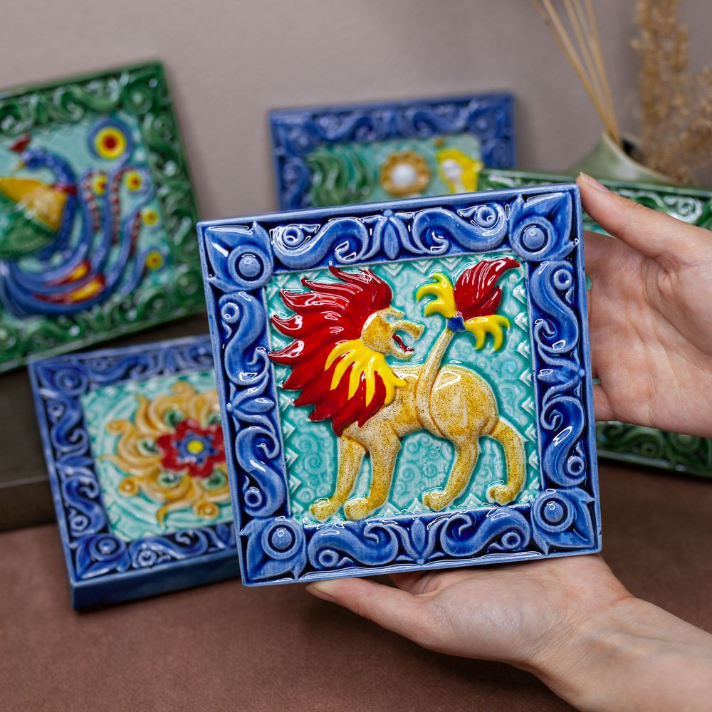 Изделие представляет керамический рельефный элемент квадратной формы, покрытый глазурью. На синем фоне яркими цветными красками нанесено стилизованное изображение льва. Образ льва – один из самых популярных в мире. Он встречается в культуре разных стран: Африки, Европы, Азии. Лев – это олицетворение справедливости, мудрости, власти и богатства. Данное изделие может быть использовано как изразец, и как самостоятельный настенный декор. При этом смотрится стильно и эффектно, может использоваться в местах, где фантазия архитектора или дизайнера по интерьеру не ограничивается типовым решением, он позволяет сделать акцент, привлекающий взгляд, внести завораживающую изюминку в интерьер. Изразец также будет прекрасным подарком родным, близким, коллегам по работе.
