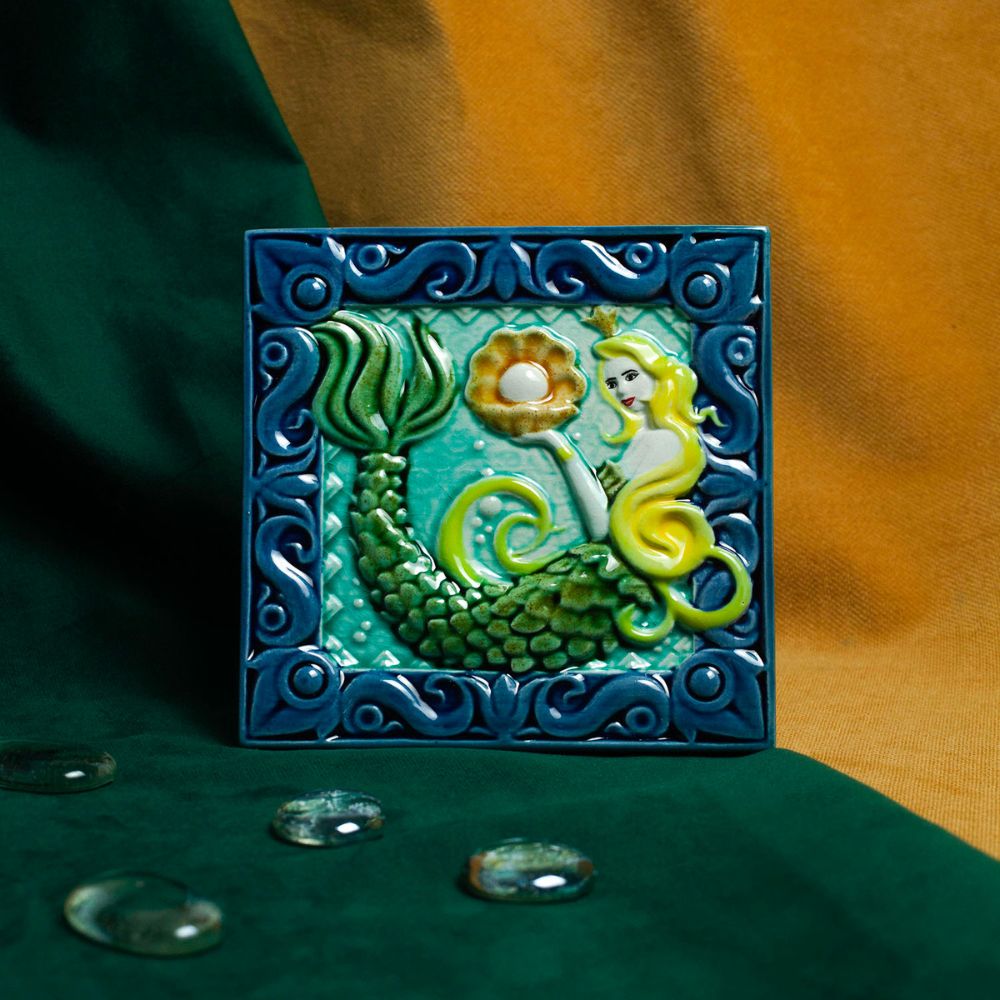 Изделие представляет керамический рельефный элемент квадратной формы, покрытый глазурью. На синем фоне яркими цветными красками нанесено стилизованное изображение Русалки, таинственной обитательницы морских и речных глубин, которая символизирует подсознательные процессы у человека и глубинные эмоции. Русалка олицетворяет красоту, игривость, сексуальность и чувственность. Данное изделие может быть использовано как изразец, и как самостоятельный настенный декор. При этом смотрится стильно и эффектно, может использоваться в местах, где фантазия архитектора или дизайнера по интерьеру не ограничивается типовым решением, он позволяет сделать акцент, привлекающий взгляд, внести завораживающую изюминку в интерьер. Изразец также будет прекрасным подарком родным, близким, коллегам по работе.