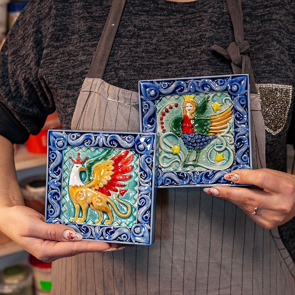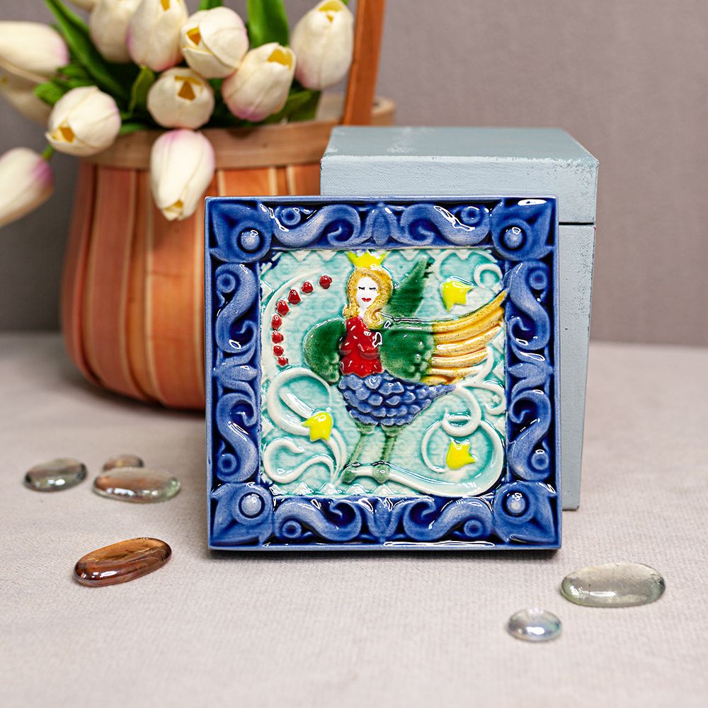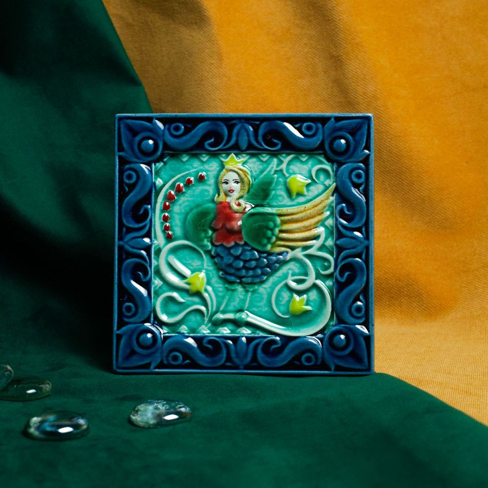 Изделие представляет керамический рельефный элемент квадратной формы, покрытый глазурью. На синем фоне яркими цветными красками нанесено стилизованное изображение райской птицы с головой девы. Птица Сирин обладает прекрасным чарующим голосом. Она покровительствует слабому полу. Сирин символизирует свободу полёта, чистоту и высокую нравственность, её изображения становятся сильнодействующими оберегами и талисманами. Данное изделие может быть использовано как изразец, и как самостоятельный настенный декор. При этом смотрится стильно и эффектно, может использоваться в местах, где фантазия архитектора или дизайнера по интерьеру не ограничивается типовым решением, он позволяет сделать акцент, привлекающий взгляд, внести завораживающую изюминку в интерьер. Изразец также будет прекрасным подарком родным, близким, коллегам по работе.