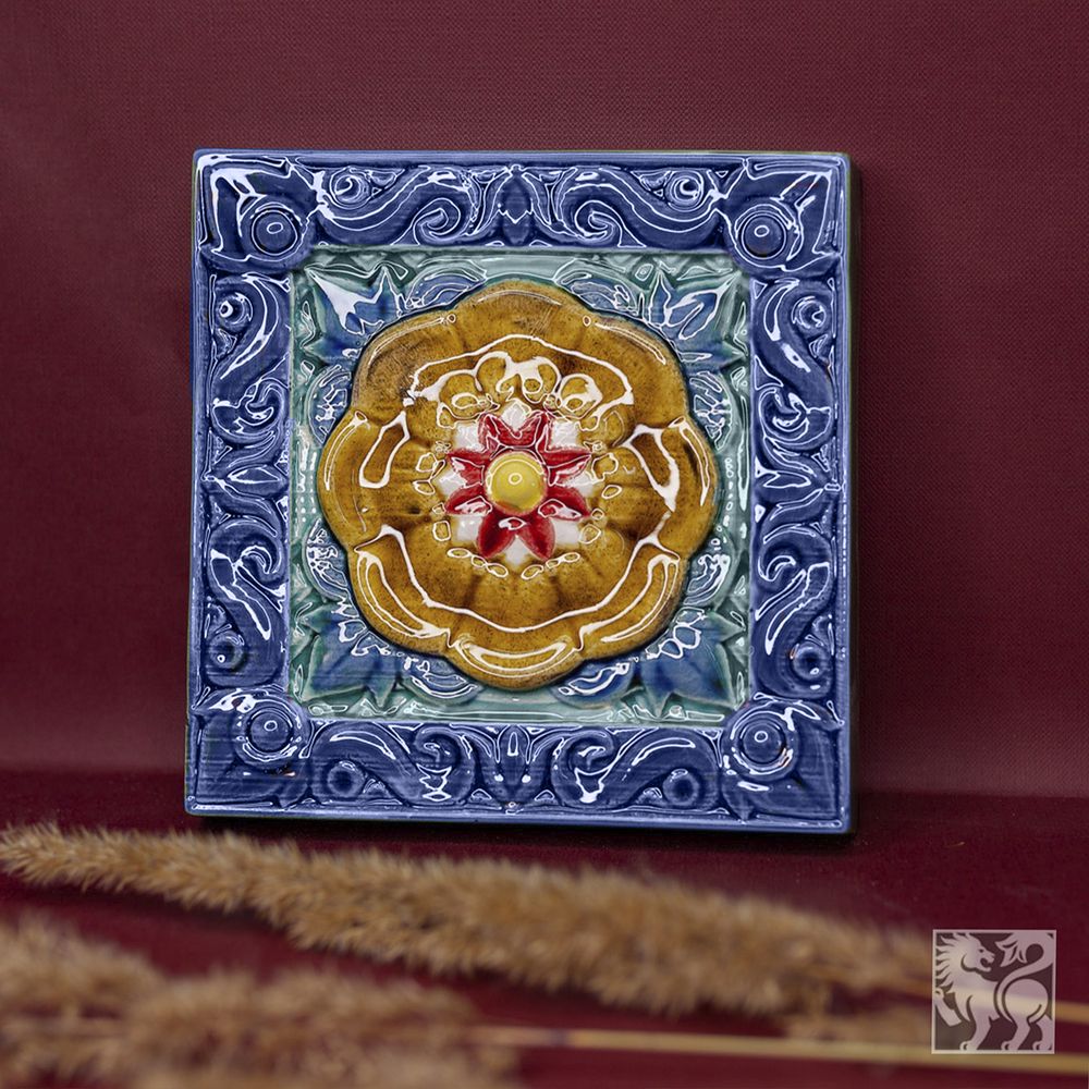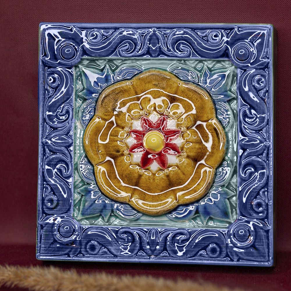 Изделие представляет керамический рельефный элемент квадратной формы, покрытый глазурью, на котором нанесено стилизованное изображение солнца. На синем фоне яркими цветными красками нанесено стилизованное изображение солнца. Солнце — источник жизни на нашей планете, поэтому с самой глубокой древности оно являлось прежде всего символом созидательной энергии. Ещё это знак мужского начала, знаний и интеллекта, величия и храбрости. При этом выбранный цвет усиливает символику изделия, поскольку синий цвет символизирует воду – живительную влагу, без которой нет жизни на Земле. Данное изделие может быть использовано как изразец, и как самостоятельный настенный декор. При этом смотрится ярко и эффектно, может использоваться в местах, где фантазия архитектора или дизайнера по интерьеру не ограничивается типовым решением, он позволяет сделать акцент, привлекающий взгляд, внести завораживающую изюминку в интерьер. Изразец также будет прекрасным подарком родным, близким, коллегам по работе.