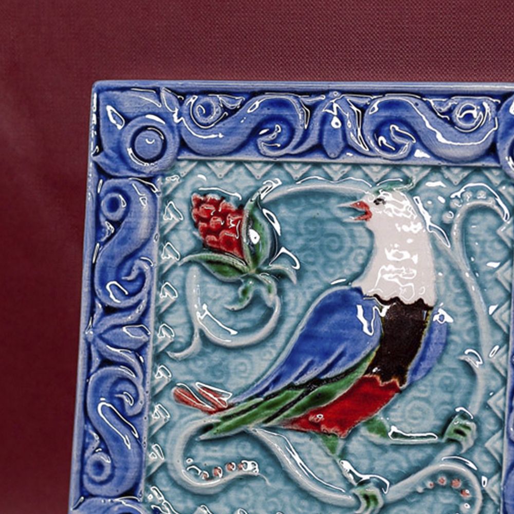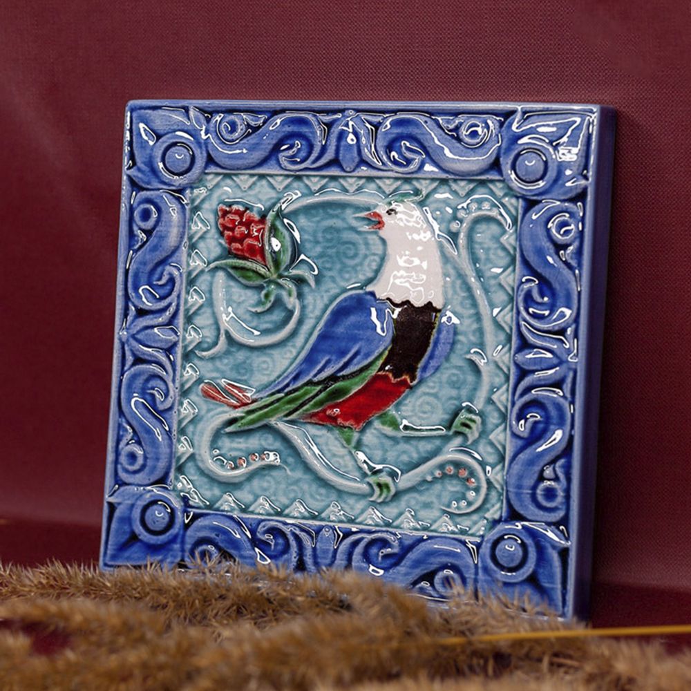 Изделие представляет керамический рельефный элемент квадратной формы, покрытый глазурью. На синем фоне яркими цветными красками нанесено стилизованное изображение соловья, вестника майских дней, певца обновления, утра, певца садов. Соловей – это символ любви и радости, трепетной человеческой души. Оберегает брачные узы, приносит мир в дом. Данное изделие может быть использовано как изразец, и как самостоятельный настенный декор. При этом смотрится стильно и эффектно, может использоваться в местах, где фантазия архитектора или дизайнера по интерьеру не ограничивается типовым решением, он позволяет сделать акцент, привлекающий взгляд, внести завораживающую изюминку в интерьер. Изразец также будет прекрасным подарком родным, близким, коллегам по работе.