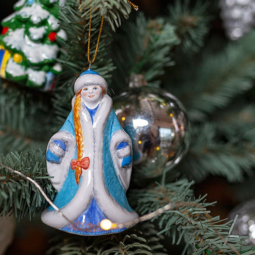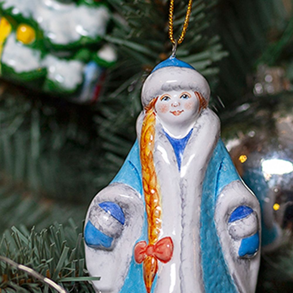 Ёлочная игрушка Снегурочка ручной работы входит в Набор «Новый год». Наш художник изобразил сказочную девушку, внучку Деда Мороза. На новогодних праздниках она выступает его постоянной помощницей и спутницей. Русская красавица обладает невероятной притягательностью, это символ чистоты, юности и веселья. Миловидная светловолосая девица по одной из версий, первоначально была вылеплена из снега. Зимним чудом Снегурочка ожила, исполняя желание бездетной пары. Благодаря драматургу Островскому, традиционный образ Снегурочки, — это зимняя красавица в шубке с меховой оторочкой, шапке и рукавичках, светлыми волосами, заплетенными в роскошную длинную косу. Елочная игрушка Снегурочка выполнена в нежных холодных оттенках, каждая характерная деталь фигурки передана с любовью к сказочному персонажу и празднику, с которым связаны детские воспоминания и ожидания чуда. Снегурочка станет замечательным подарком на Новый год и Рождество.