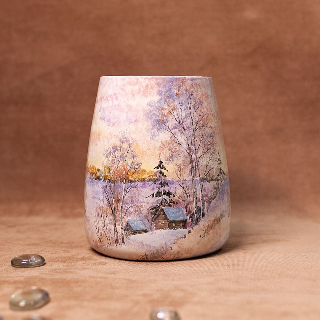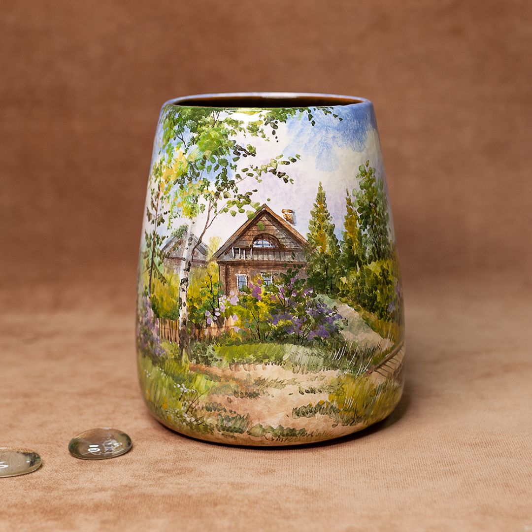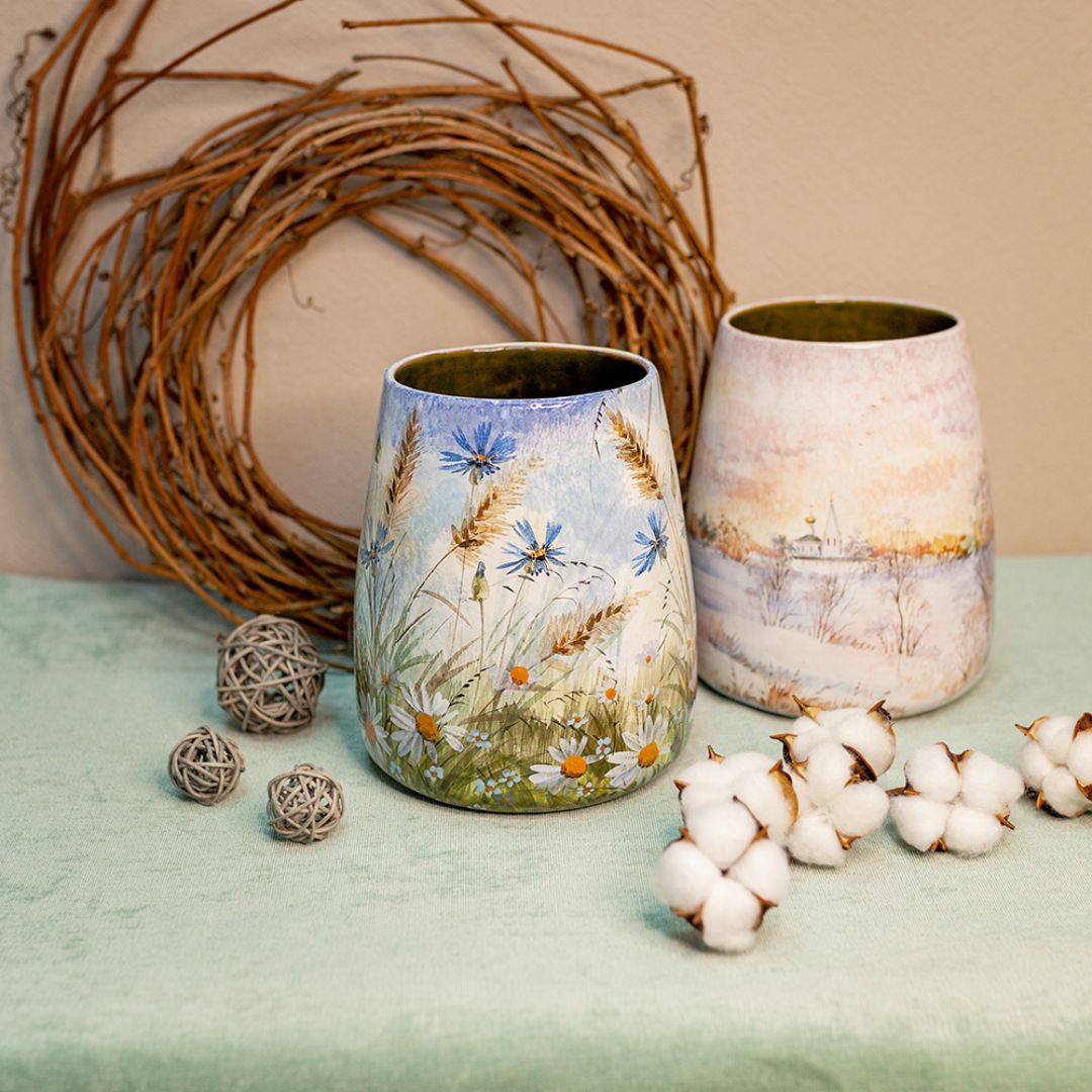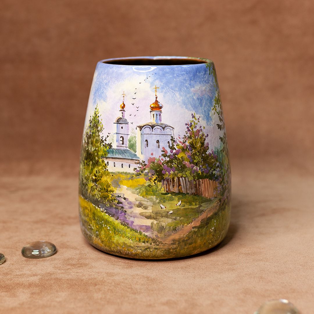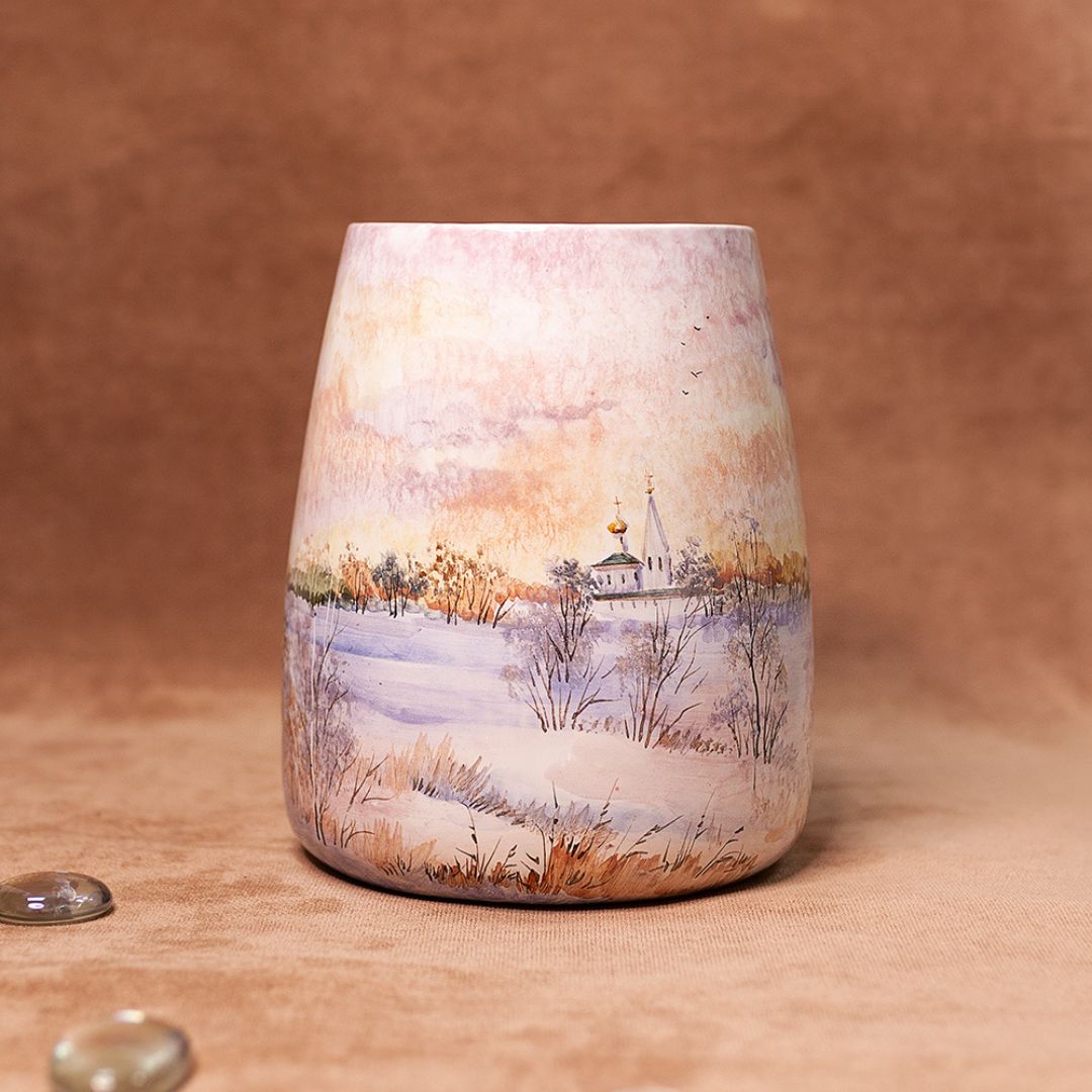 Это изделие ручной работы представляет собой сосуд изящной формы, который по виду напоминает трапецию. Данное изделие искусно расписано художником и всегда будет эффектным акцентом в интерьере, поскольку живопись никогда не выйдет из моды, ведь ничто не заменит живую душу, вложенную художником в рисунок. Такая ваза будет эффектно смотреться в интерьере, создаст настроение, будет прекрасным подарком по любому поводу.