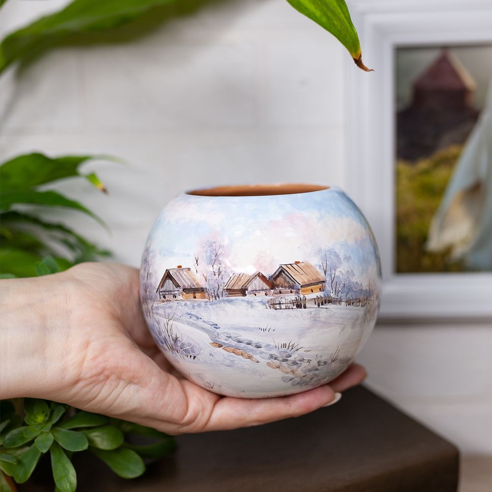 Это изделие ручной работы представляет собой сосуд круглой формы. Шар-это символ Мироздания, Космоса, Солнца, планет. Ваза шар искусно расписана художником. Роспись все время индивидуальна и неповторима. Такая ваза будет стильно смотреться в интерьере, создаст настроение, будет замечательным подарком по любому поводу.