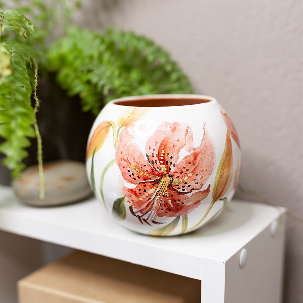 Это изделие ручной работы представляет собой сосуд круглой формы. Шар-это символ Мироздания, Космоса, Солнца, планет. Ваза шар искусно расписана художником. Роспись все время индивидуальна и неповторима. Такая ваза будет стильно смотреться в интерьере, создаст настроение, будет замечательным подарком по любому поводу.
