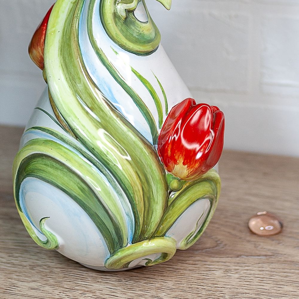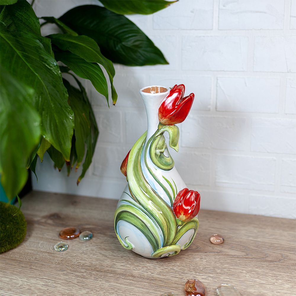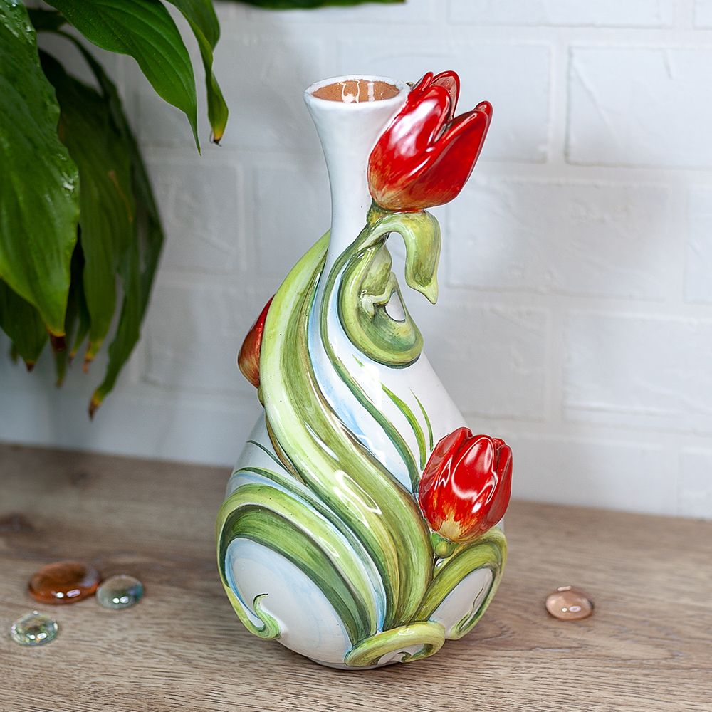 Это изделие ручной работы представляет собой сосуд изящной формы с живописными лепными украшениями в виде тюльпанов. Тюльпан – это символ весны и нежности. Он олицетворяет окончание холодов и радость от солнечных согревающих лучей. Ваза с этими яркими цветами будет эффектным акцентом в интерьере, создаст настроение праздника, будет замечательным подарком по любому поводу.