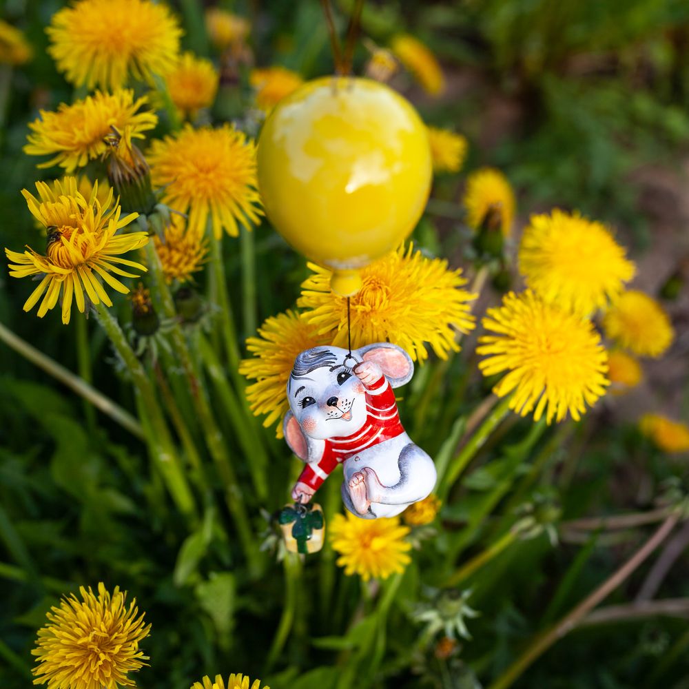 Подвес “”Мышонок с шаром”” изготовлен в технике майолика, украшен ручной художественной росписью и входит в коллекцию “”Воздушные приключения””. Оригинальный подвес несомненно станет ярким элементом декора, способным создать вашем доме сказочную атмосферу. Его яркий и игривый дизайн обязательно вызовет улыбку у любого и придется по вкусу как детям так и взрослым. Прекрасно подойдет для украшения детской комнаты, кухни, террасы и новогодней ёлки. Мышонок будет прекрасным подарком для близких на любое торжество и просто для хорошего настроения.”